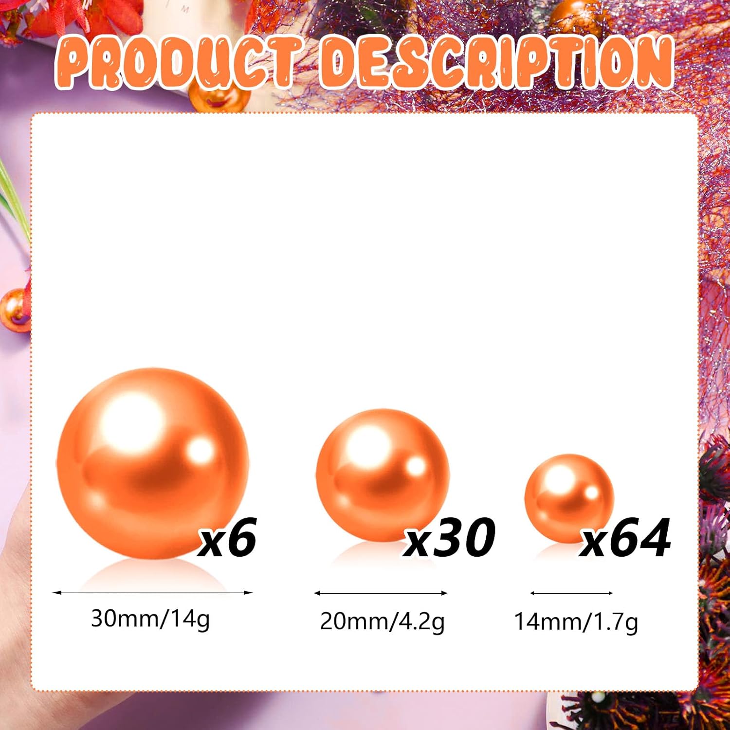 100PCS Orange Faux Pearls Beads for Centerpiece Vases, Vase Filler Faux Pearls, No Holes Filler Beads for Party Anniversary Birthday Wedding Table Decor, 14/20/30mm