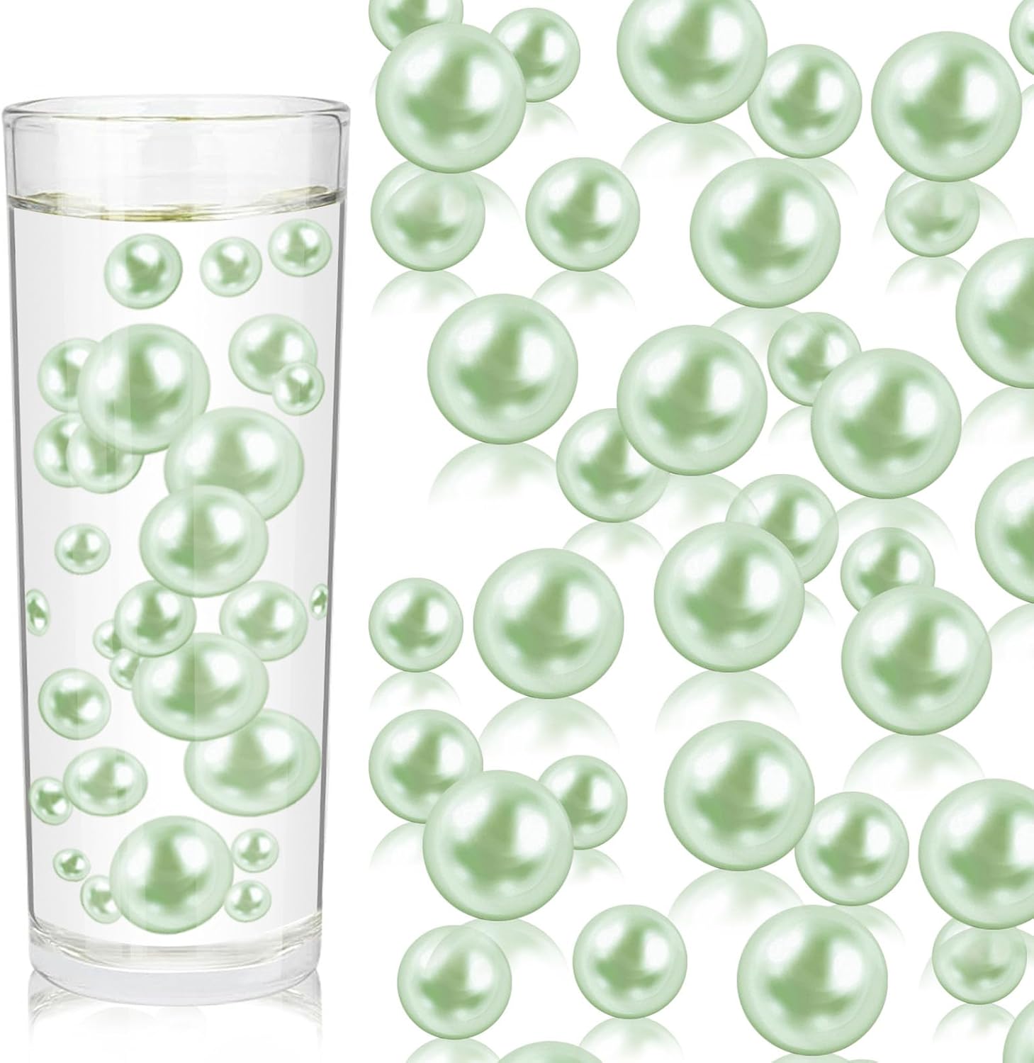 100PCS Light Green Faux Pearls Beads for Centerpiece Vases, Vase Filler Faux Pearls, No Holes Filler Beads for Easter Party Anniversary Birthday Wedding Table Decor, 14/20/30mm