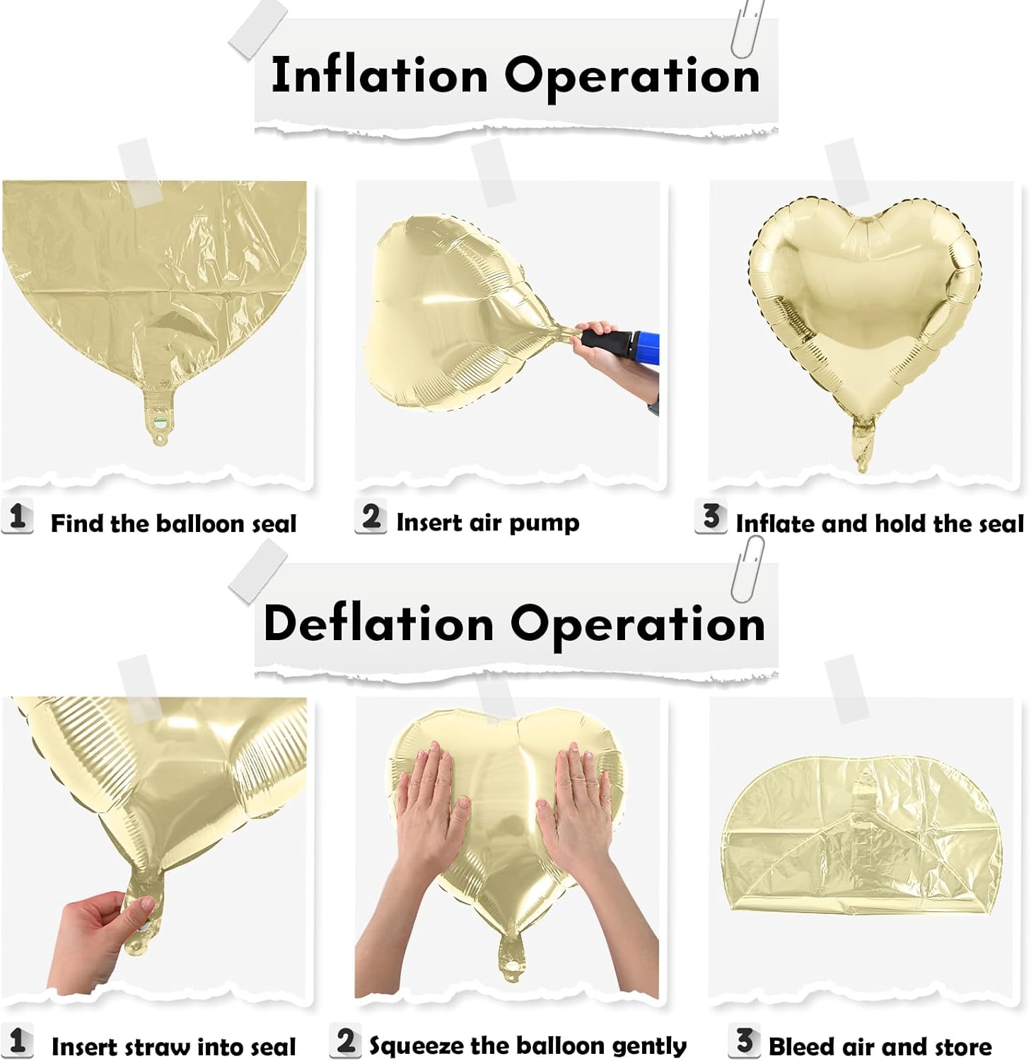 • Gold White Heart Balloons: There are 10pcs 18 inch heart foil balloons. Includes 5pcs 18 inch light gold heart foil balloons, 5pcs 18 inch white heart foil balloons and 1pc ribbons.