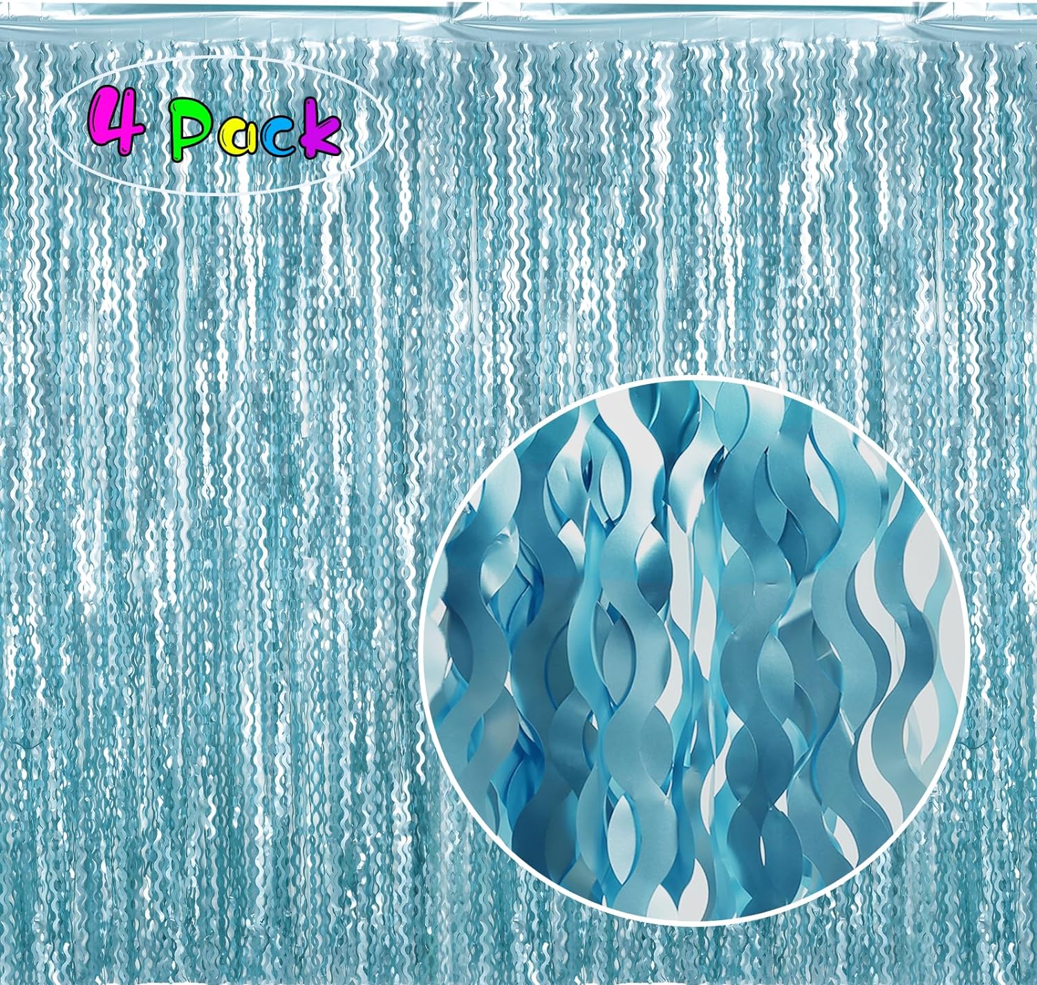4 Pack Wavy Blue Foil Fringe Curtain 3.3x6.6 Feet | Blue Streamers Tinsel Backdrop for Under The Sea Party Decorations | Ocean Backdrop | Mermaid Birthday Decorations