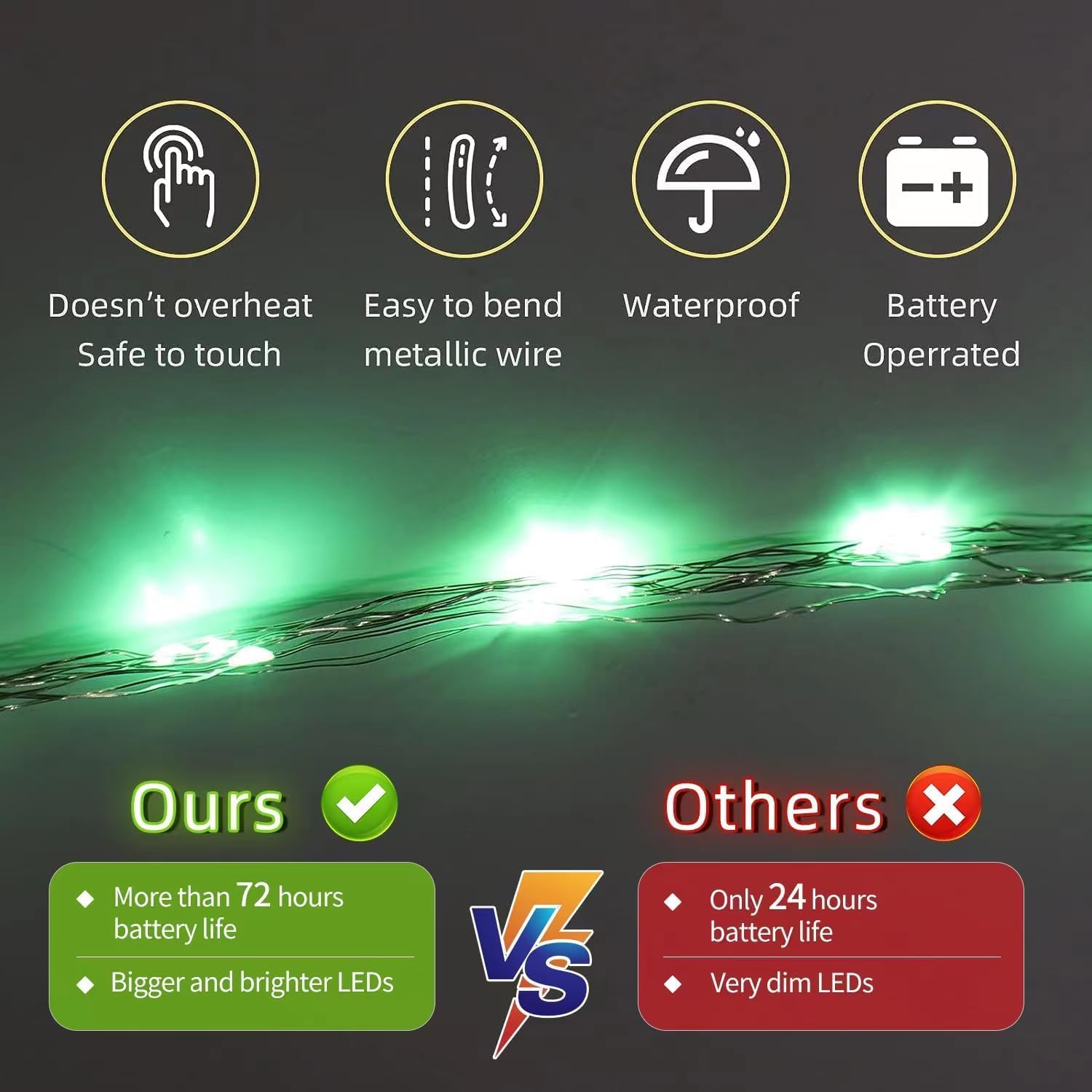 • DIY FAIRY WIRE LIGHTS: mini fairy lights by battery operated, bright and Green fairy lights. Each fairy light has 20 small lights, can give you happy feelings like in a fairy tale world. Led fairy lights are made of 6.6 feet of high quality silver coated copper wire, which makes battery light string more stronger and durable.