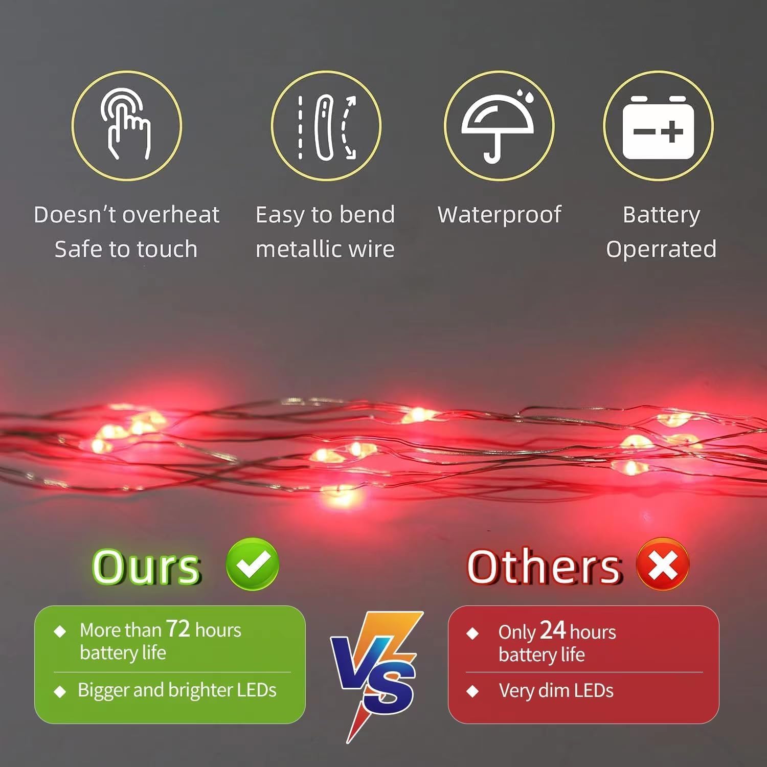 • DIY FAIRY WIRE LIGHTS: mini fairy lights by battery operated, bright and RED fairy lights. Each fairy light has 20 small lights, can give you happy feelings like in a fairy tale world. Led fairy lights are made of 6.6 feet of high quality silver coated copper wire, which makes battery light string more stronger and durable.