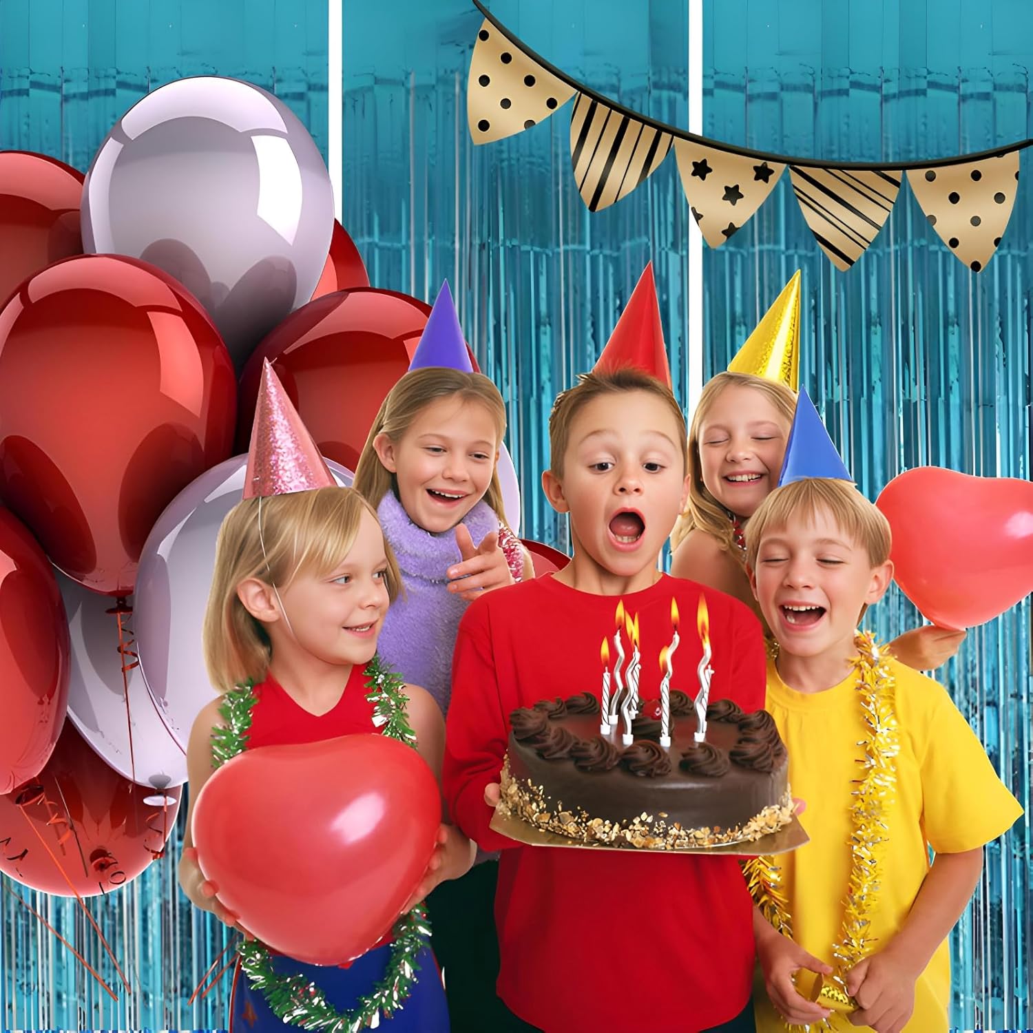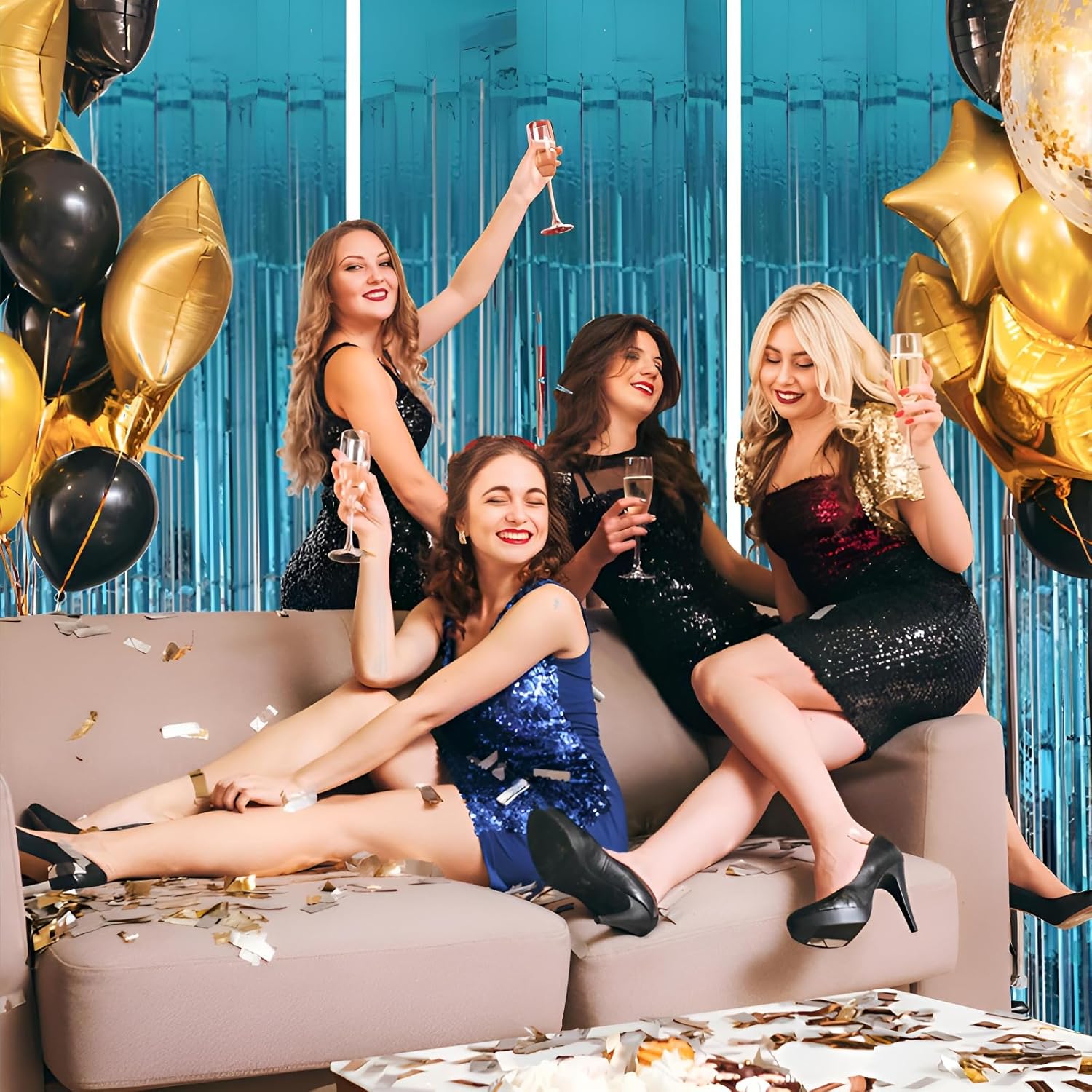 • Pair with other party decorations: Tinsel backdrop curtain can be paired with LED lights, balloons, banners, wreath, garlands, swirl streamer, tissue paper pom poms.