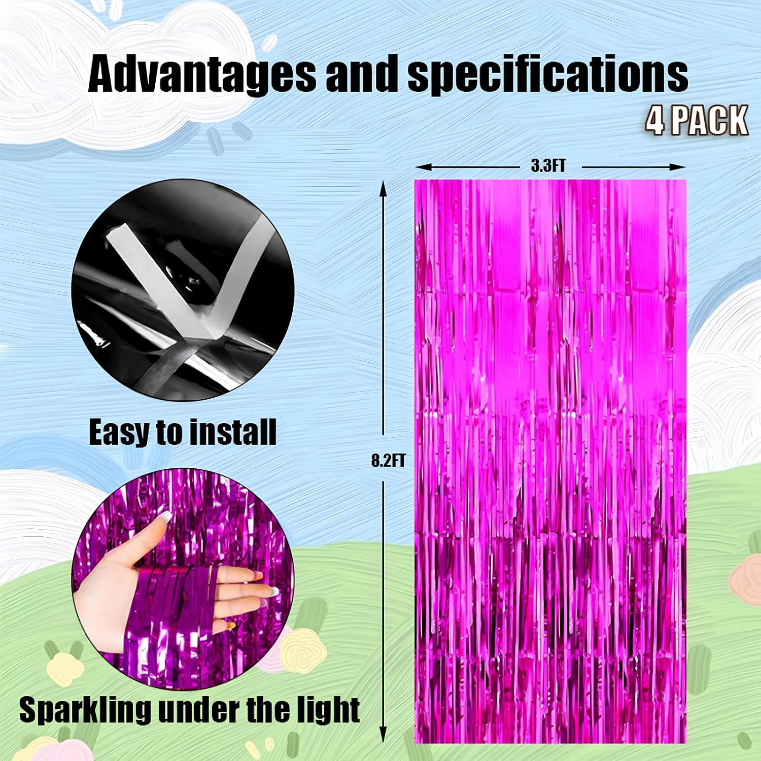 • 4 Pack foil fringe tinsel backdrops: each measuring a whopping 3.3 ft x 8.3 ft.Long enough for indoor or outdoor parties. Also can be cut in suitable length for your birthdays Party decorations These backdrops are perfect for creating stunning party decorations, event backdrops, and photo booths that will leave your guests in awe.