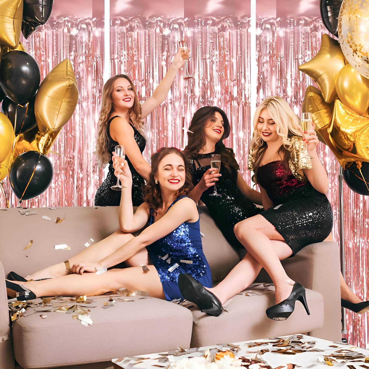 • Pair with other party decorations: Tinsel backdrop curtain can be paired with LED lights, balloons, banners, wreath, garlands, swirl streamer, tissue paper pom poms.