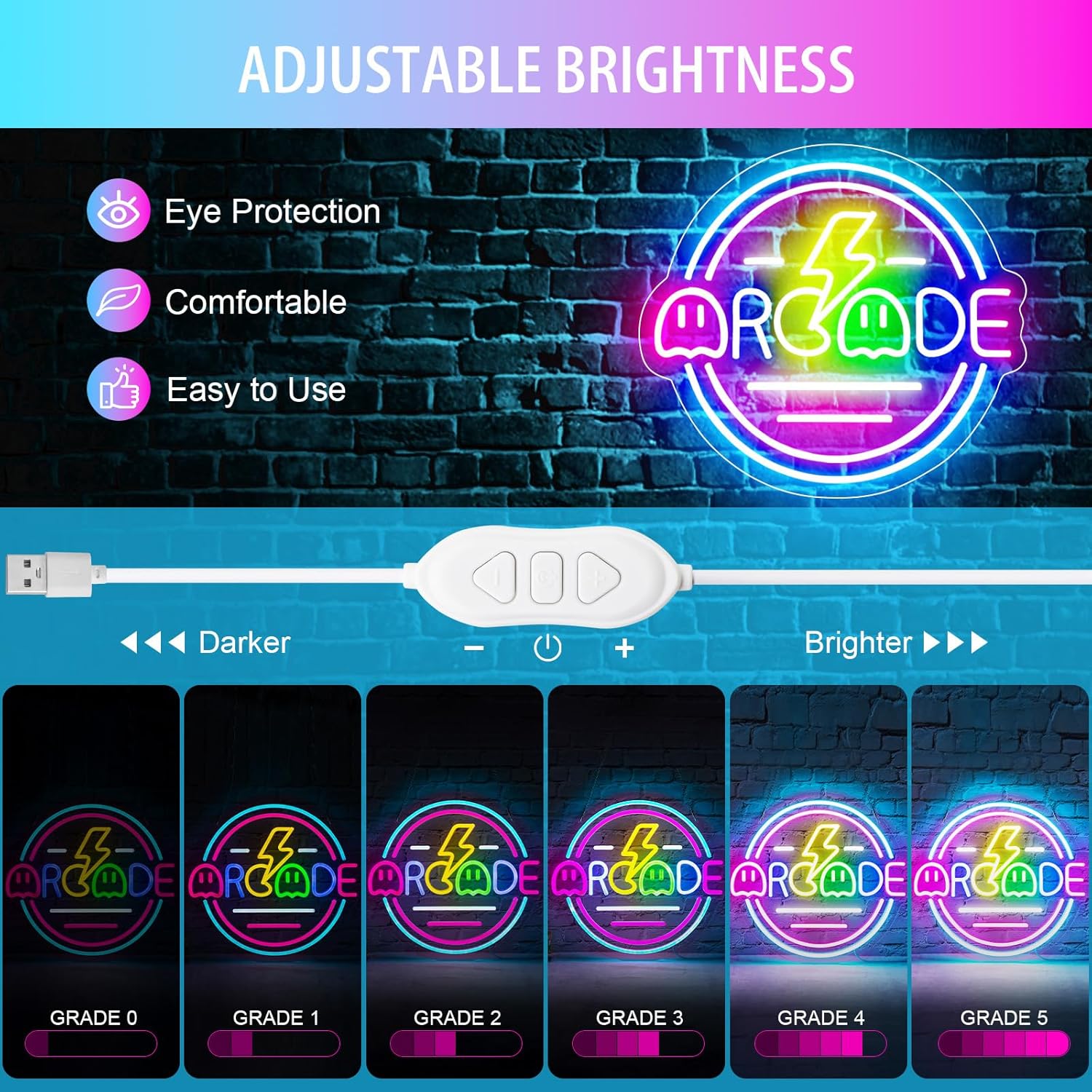 • 🔆【UPGRADED - DIMMABLE BRIGHT】Basaneon Gaming neon signs have upgraded the adjustable brightness(5 levels of brightness), you can use the dimming button to control brightness to achieve the desired effect, Different games require different atmospheres and brightness, because I am also a player and I have a clear understanding of each player's needs, believe our video game neon light can give you a happy gaming experience.