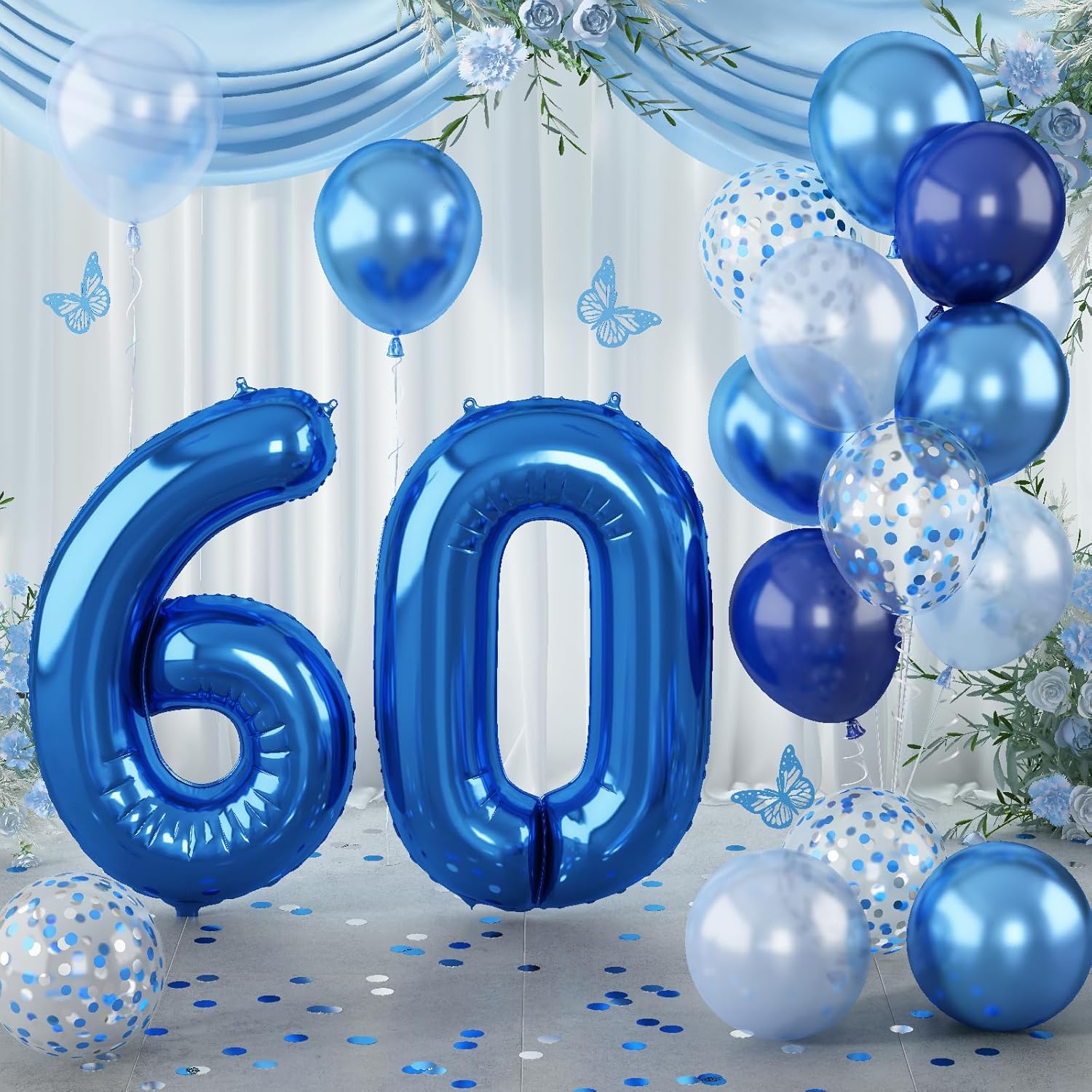 • 💓 Dark Blue Number 60 Balloon: Our package included 40 inch foil number 60 balloon(2pcs), 12 inch metallic blue balloon(4pcs), blue silver confetti balloon(4pcs), pastel blue balloon(4pcs), Light Navy Blue Balloon(2pcs), 1pcs straw and 1 roll ribbon. Simply inflate the balloon using the straw, and you're ready to party! Navy blue number foil balloons are the best for men or women birthday party decoration.