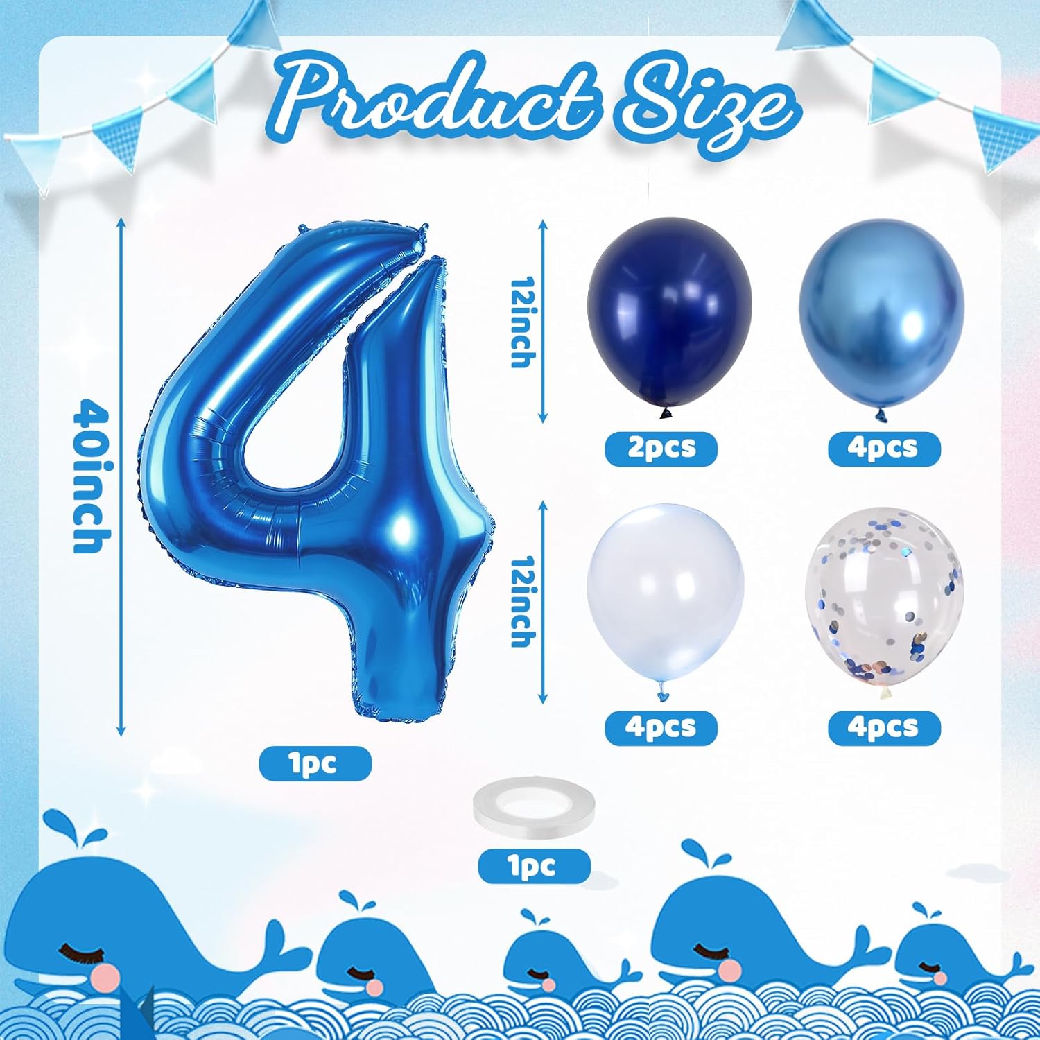 • 💓 Dark Blue Number 4 Balloon: Our package included 40 inch foil number 4 balloon(1pcs), 12 inch metallic blue balloon(4pcs), blue silver confetti balloon(4pcs), pastel blue balloon(4pcs), Light Navy Blue Balloon(2pcs), 1pcs straw and 1 roll ribbon. Simply inflate the balloon using the straw, and you're ready to party! Navy blue number foil balloons are the best for girls or boys birthday party decoration.