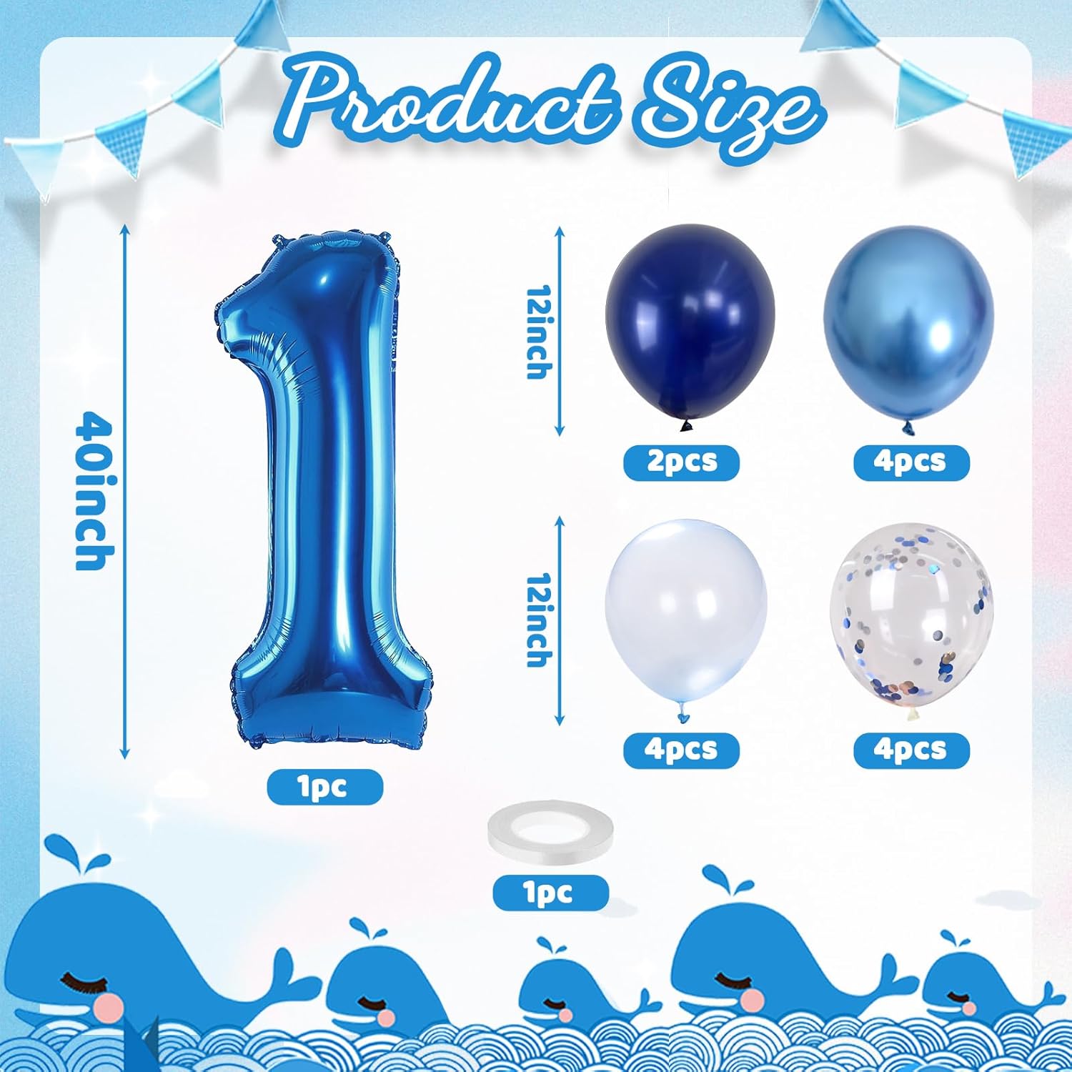 • 💓 Dark Blue Number 1 Balloon: Our package included 40 inch foil number 1 balloon(1pcs), 12 inch metallic blue balloon(4pcs), blue silver confetti balloon(4pcs), pastel blue balloon(4pcs), Light Navy Blue Balloon(2pcs), 1pcs straw and 1 roll ribbon. Simply inflate the balloon using the straw, and you're ready to party! Navy blue number foil balloons are the best for girls or boys birthday party decoration.
