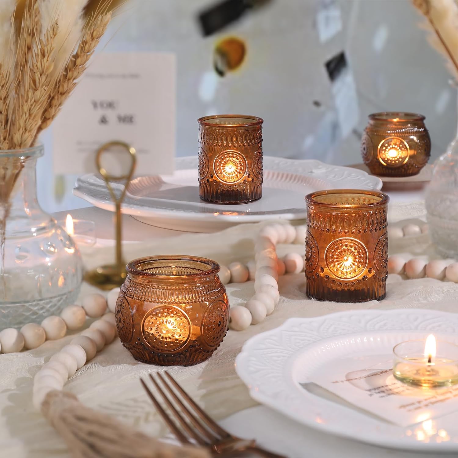 • ❤️❤️[ Votive Candle Holders Set ]❤️❤️: You will get 12 pack amber votive candle holders in your package, including 6 glass votives and 6 bowl glass votives.The dimensions are 2.1ʺD x 2.56ʺH and 2.1ʺD x 2.1ʺH approximately. These glass votive candle holders are the perfect complement to any dining table, which can be used with regular votive candles, tea light candles, flameless LED tea waxes, and edible butter candles, creating a warm and inviting ambiance that enhances the dining experience.