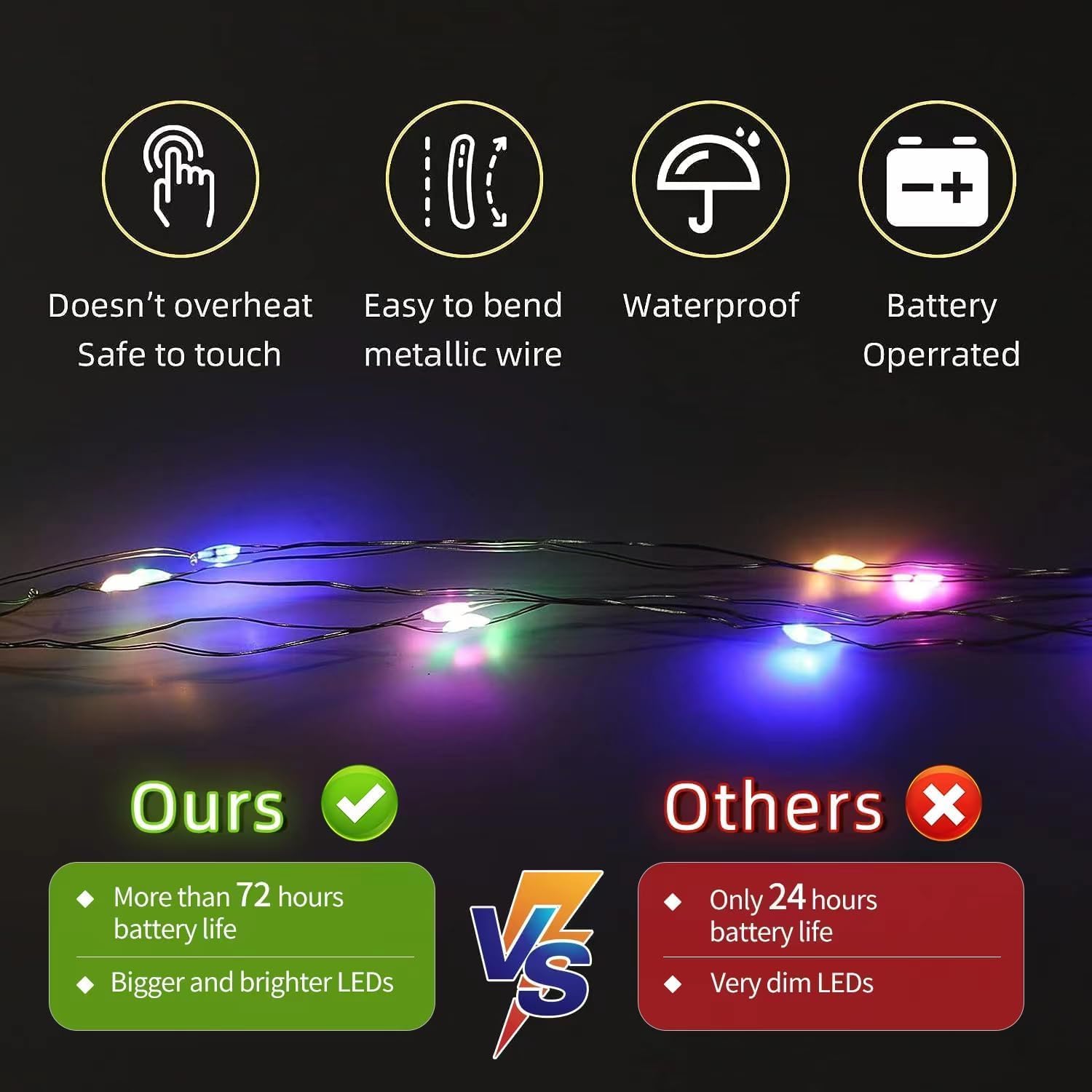 • DIY FAIRY WIRE LIGHTS: mini fairy lights by battery operated, bright and Multicolour fairy lights. Each fairy light has 20 small lights, can give you happy feelings like in a fairy tale world. Led fairy lights are made of 6.6 feet of high quality silver coated copper wire, which makes battery light string more stronger and durable.