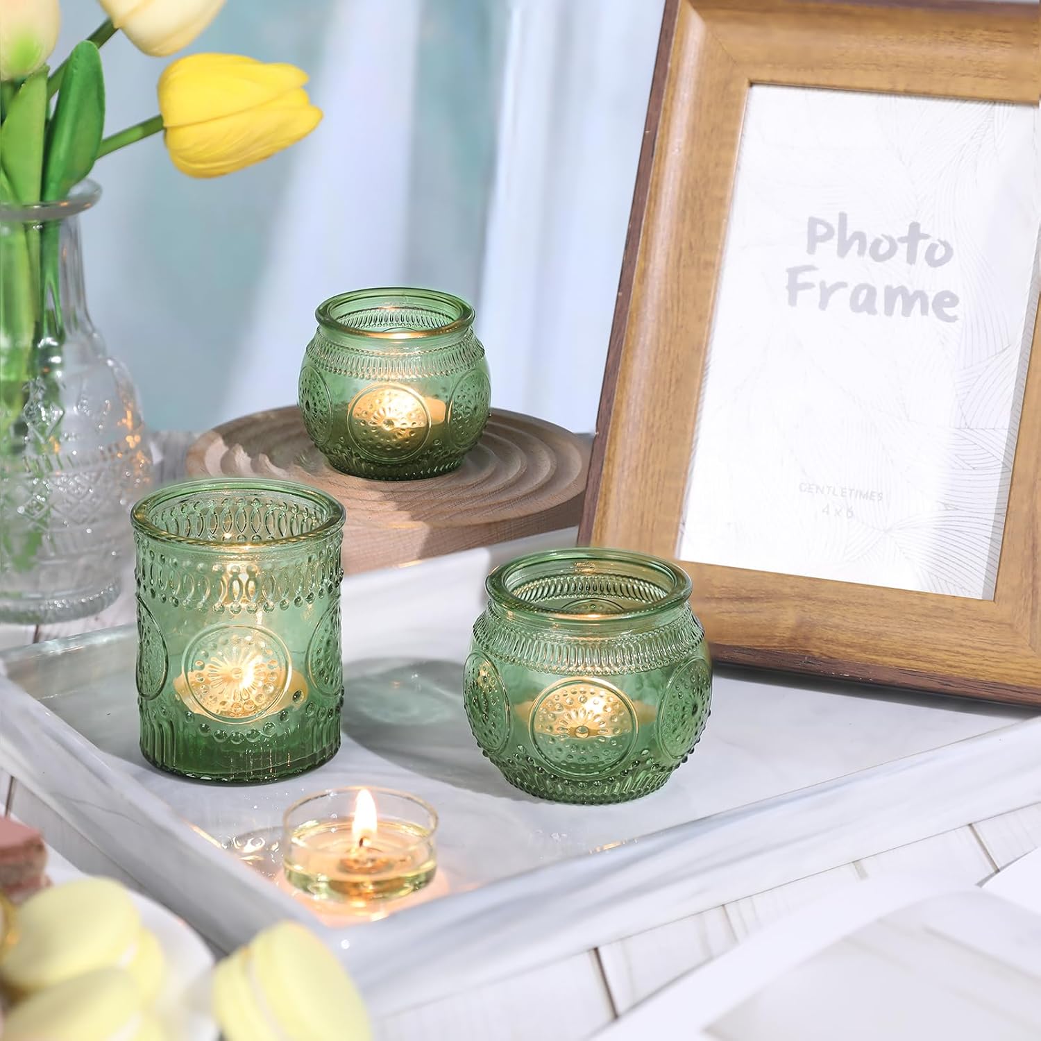DARJEN 12Pcs Green Votive Candle Holders - Glass Tea Light Candle Holder for Wedding Shower, Candle Holder Bulks for Wedding & Home Table Decor, Vintage Parties Gifts