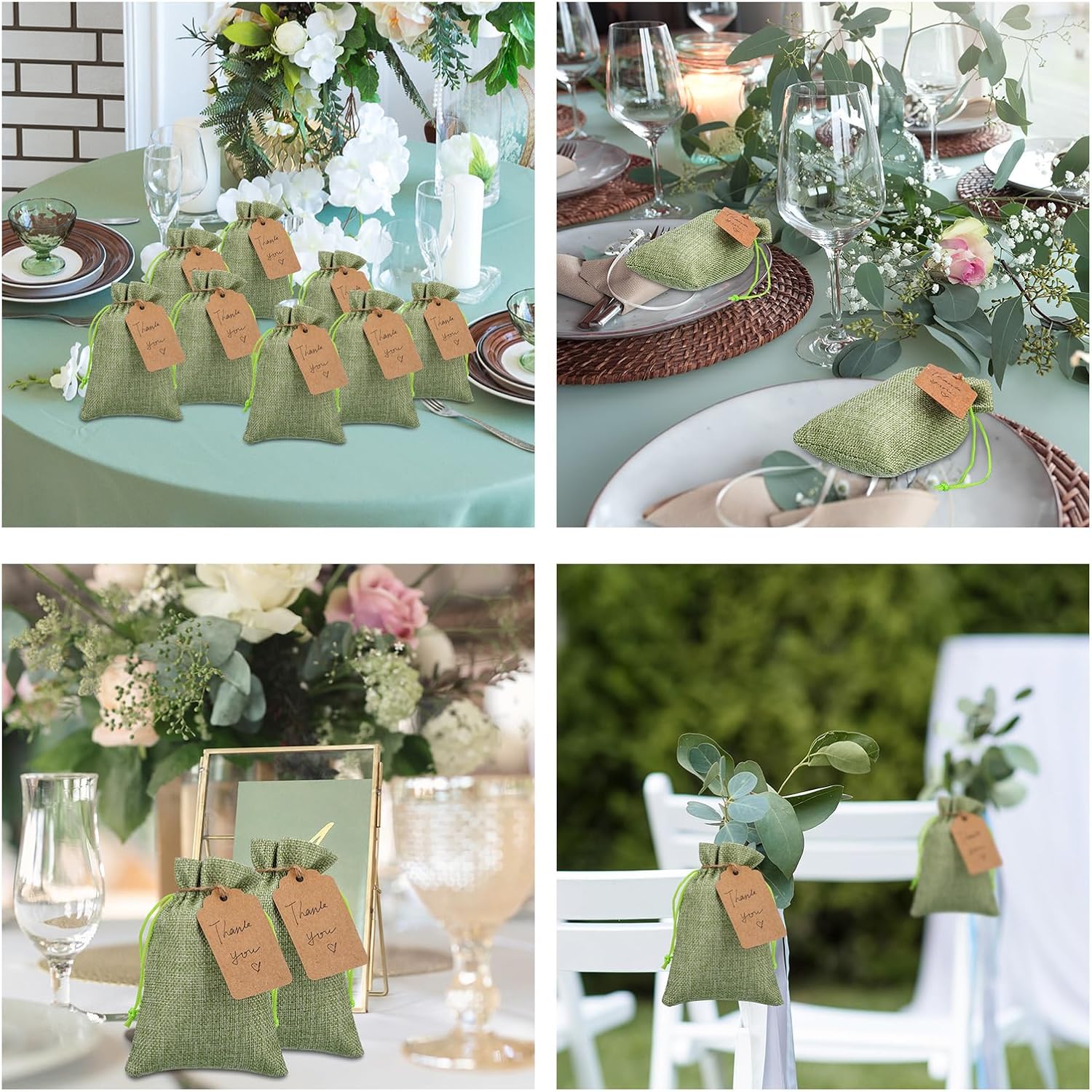 Woanger 100 Pcs Burlap Gift Bags with 100 Pcs Kraft Paper Gift Tags with Drawstring Favor Bulk Burlap Sack Bags for DIY Wedding Party Craft(4 x 6 Inch,Sage Green)