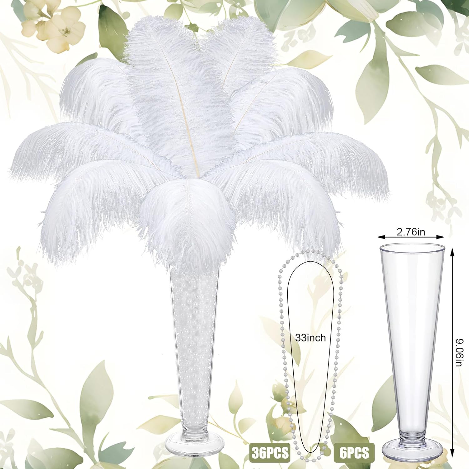6 Sets Wedding Table Centerpiece Accessories Including 159 Pieces Natural Ostrich Feather Bulk Plastic Vases and Beads Necklaces for Wedding Home Party Centerpiece Supplies(White)
