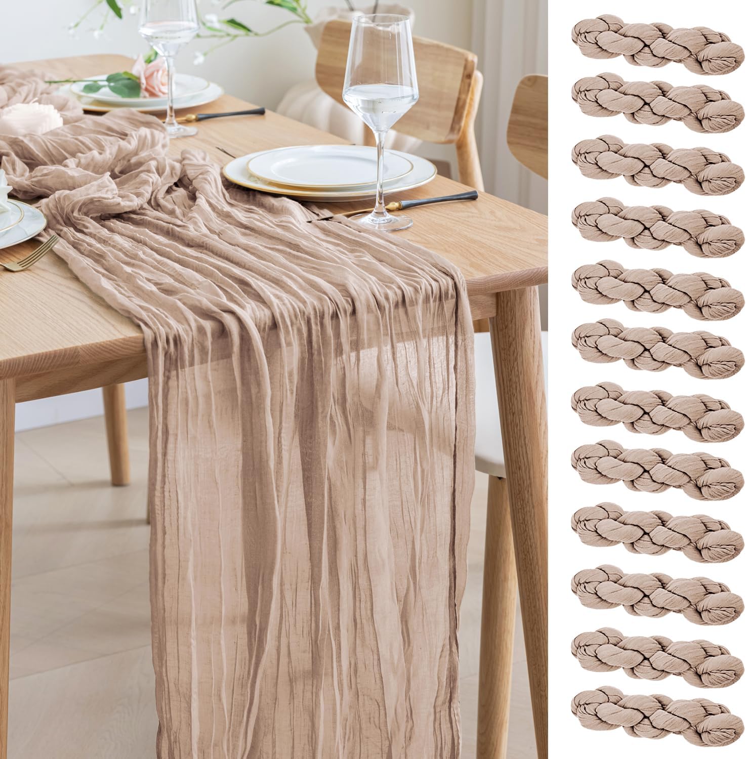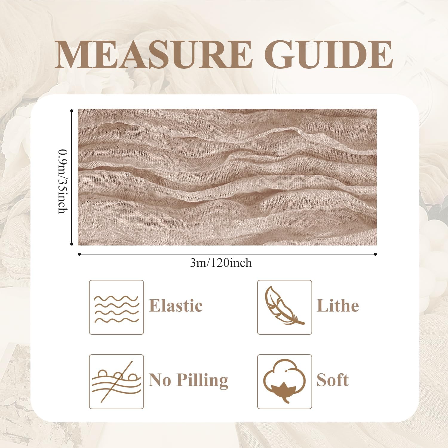 • 【Cheesecloth Table Runner】 Size: 35" W x 120" L. You will get 12 pieces 10FT length cheesecloth table runner. The sheer rustic table runner is long enough to span a large table and drape gracefully across the table. It will gently sway in the wind, adding a romantic atmosphere to your occasion. These eye-catching gauze table runners are ideal for arranging an elegant, stylish tablescape.