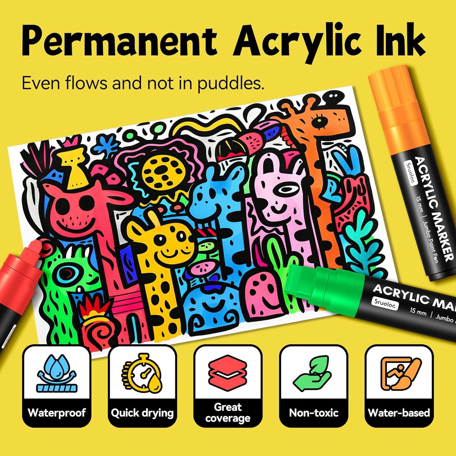 • Jumbo Markers Set: SRUOLOC jumbo markers are made with the highest quality water-based acrylic ink. That is waterproof, quick-drying, permanent , and smooth flow