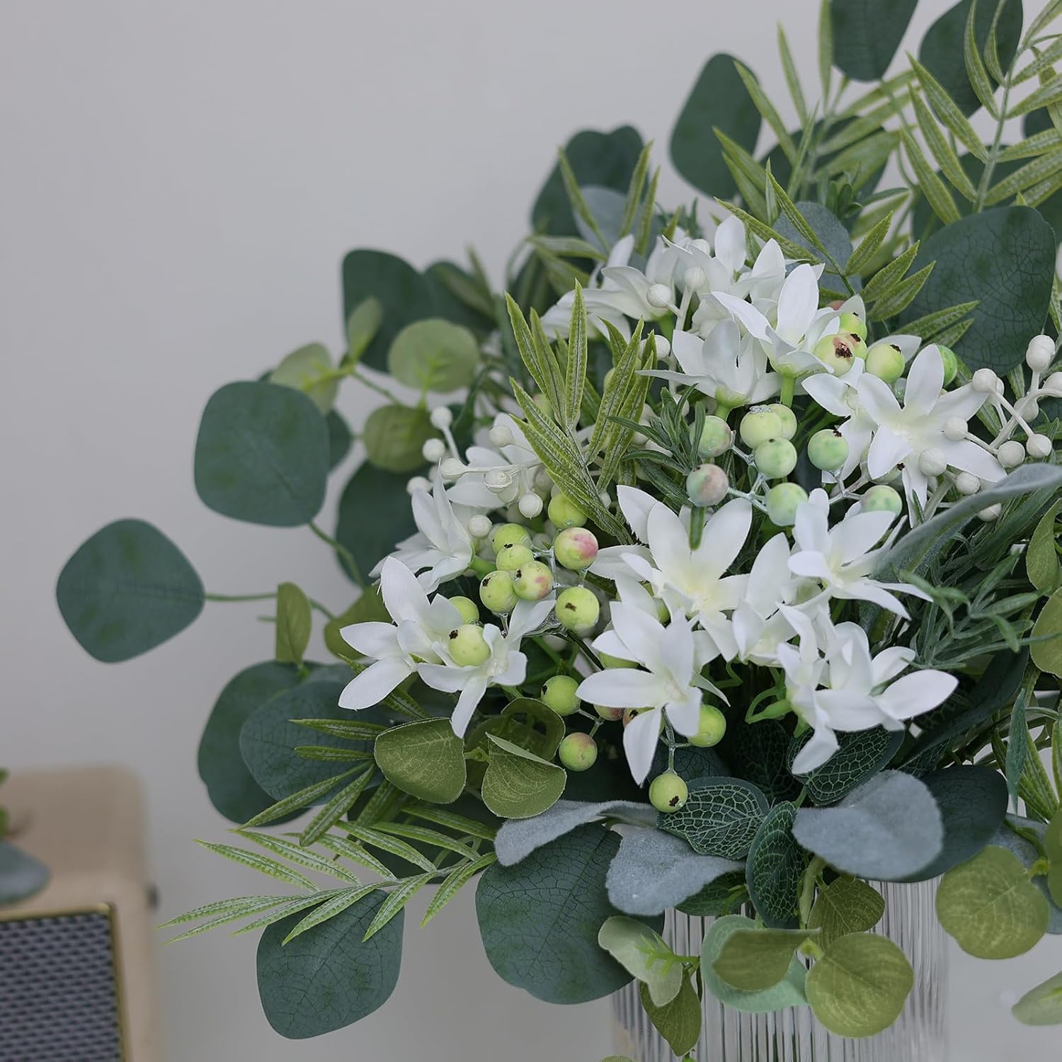 • 【Realistic appearance】: The gray-green leaves are covered with flocking, and these leaves have been specially treated with a little white powder to add authenticity, making them look lifelike and very cute. This combination is not only a great filler for making bouquets, centerpieces, but can also make beautiful bouquets yourself.