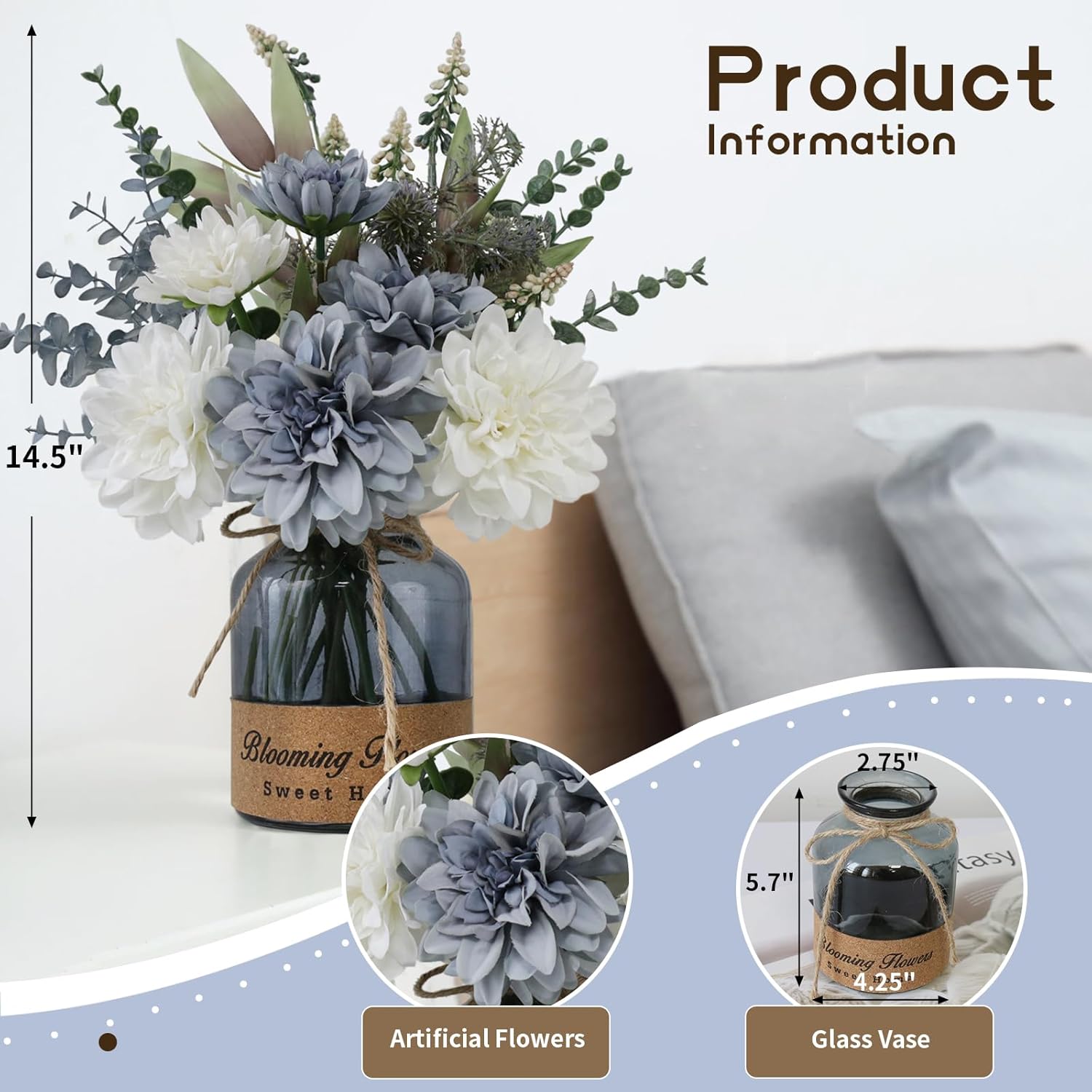 • Fake Flowers in Vase:Artificial flowers for decoration include 6 blue and white artificial dahlia flowers,fake plants,eucalyptus stems,willow leavesa and glass bottle,the glass bottle mouth is tied with hemp rope and tied in a bow