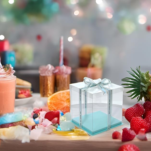 • 【Size and material】-The product includes 6 transparent cake boxes with a roll of white ribbon. Cake Box size: 12"x12"x10", suitable for large cakes and gift packaging. The large cake boses made of cardboard and PET materials, safe and durable. The top and middle part of the cake box are transparent, and the bottom covers is white
