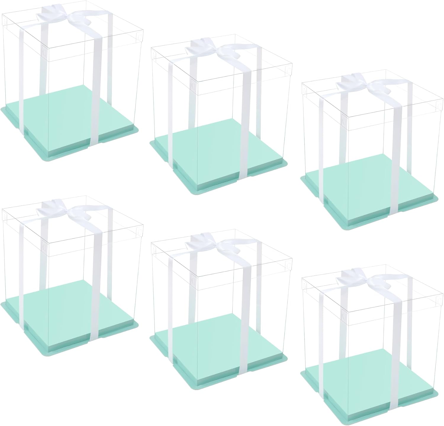 XININSUN clear cake box with ribbon,10inch 12inch cake boxes,transparent tall cake box cake carrier,Square Cardboard Cake Containers clear gift box for Wedding,Birthday,Party(6pcs-green)