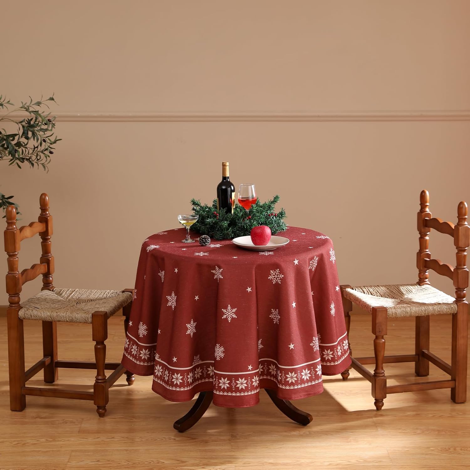 ISAENNE Designer Christmas Red Small Round Tablecloth,Linen Table Cloth with Snowflakes Pattern,Wrinkle Resistant Decor Tablecloths for Dining Kitchen Thanksgiving Christmas,Diameter 55"-Carol C
