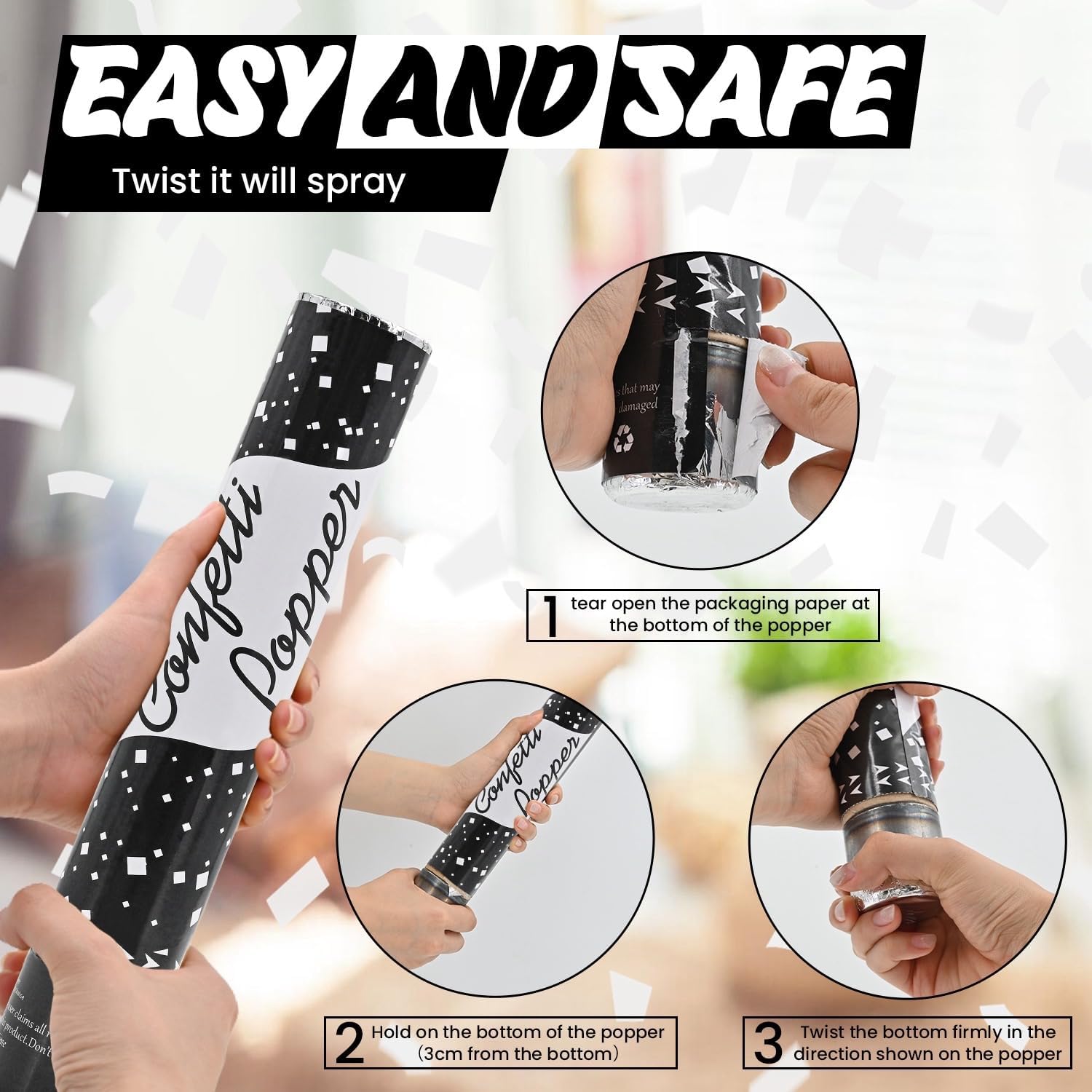 • 【BEFORE USE CONFETTI POPPERS】Please read the instructions and tear open the packaging paper at the bottom of the popper, then easy to twist it! In order to provide you with a better experience with confetti cannon and avoid being unable to twist.