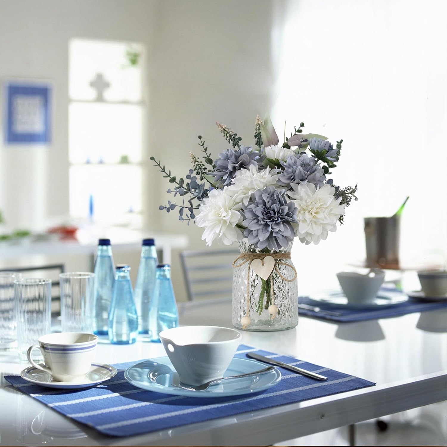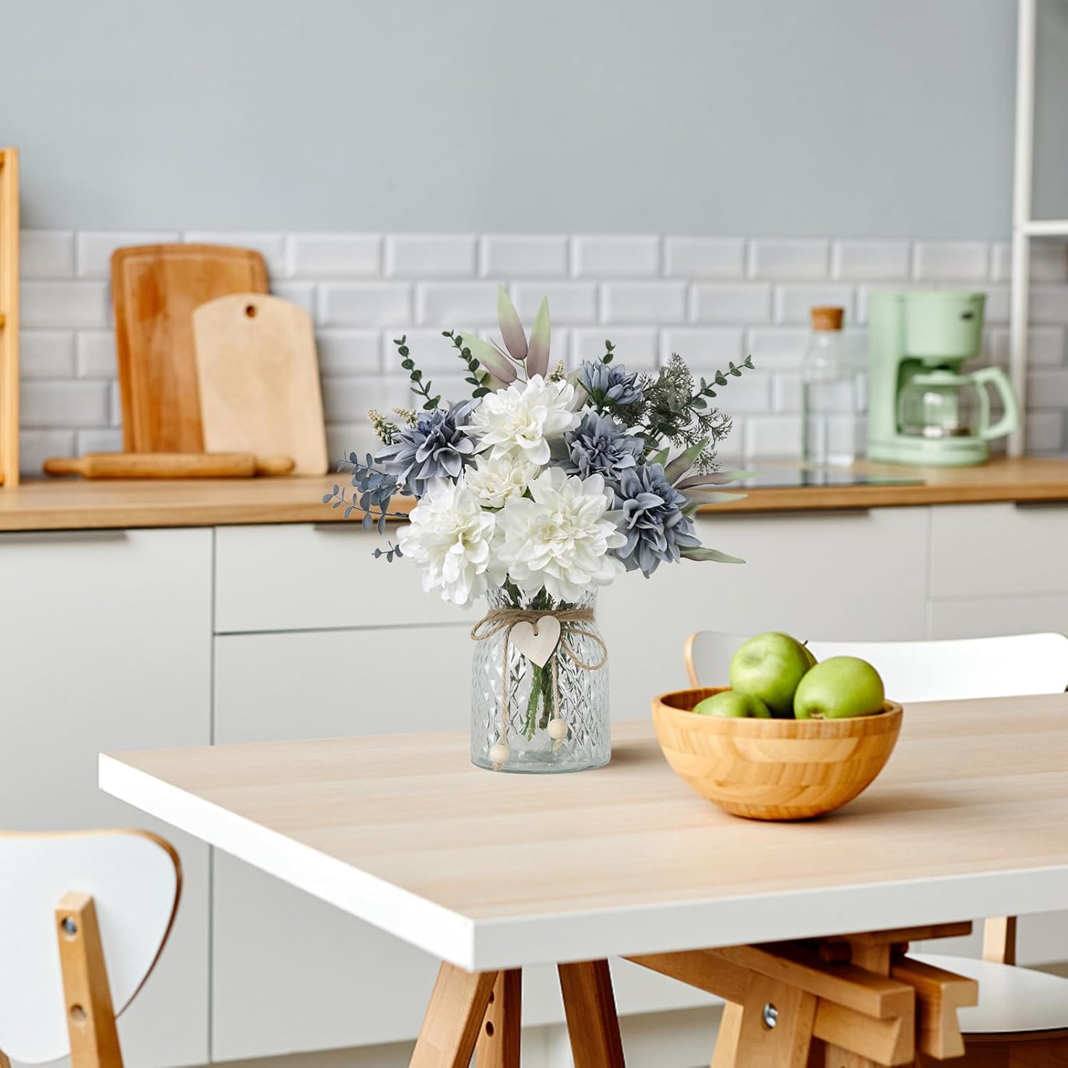 • Fake Flowers in Vase:Artificial flowers for decoration include 8 blue and white artificial dahlia flowers,fake plants,eucalyptus stems,willow leavesa and matched flower arrangement rack and glass bottle,the mouth of the glass bottle is tied with hemp rope, and the bottle body has a wooden heart and a spherical pendant,enhance your living room,kitchen table,bathroom,fireplace,dresser,desk,coffee table decor with these realistic fake flowers in vase that bring a touch of nature indoors