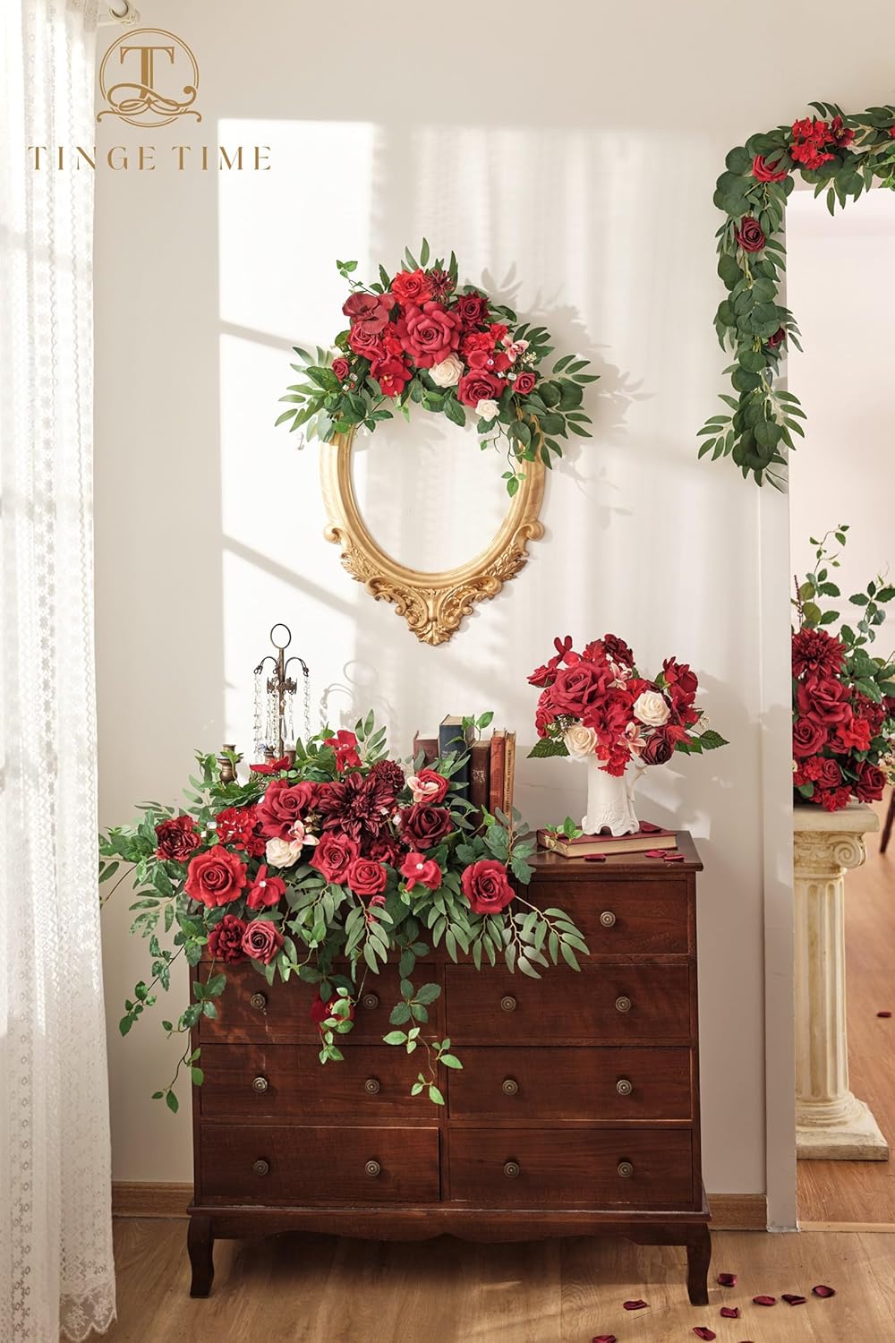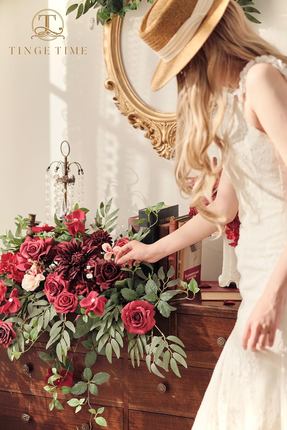 • 【High-quality Materials】The table floral swag measuring 37.4'' in length by 23.6'' in width, is made of high-quality silk and foam, main flower is burgundy rose, red dahlia, red rose, red ranunculus, red phalaenopsis, red hydrangea, foam red rose, foam champange rose and come with some red jewels.