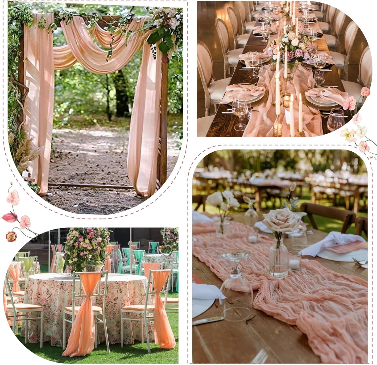 • 【Diversified Use】Boho cheesecloth Table Runner is necessary choice for beautifying tables. It's used for home decor, outdoor events, formal and informal setting in all seasons. Such as wedding decor, baby shower, bridal showers, parties, engagement banquet, Valentine's Day, Thanksgiving, Christmas.