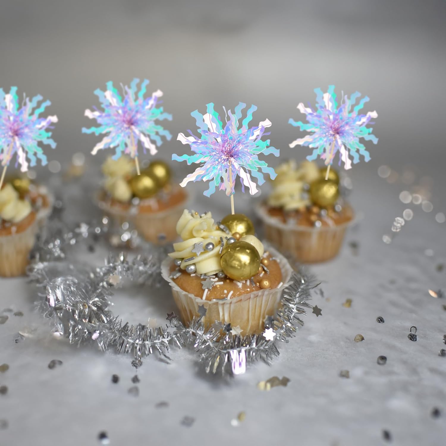• -Premium Material: These Foil Firework Cupcake Toppers are made of high quality foil and food-grade toothpick, very safe to put them on cakes, cupcakes, ice cream, fruits, pie, dessert, cheese or any dish and food appetizer you want to decorate.