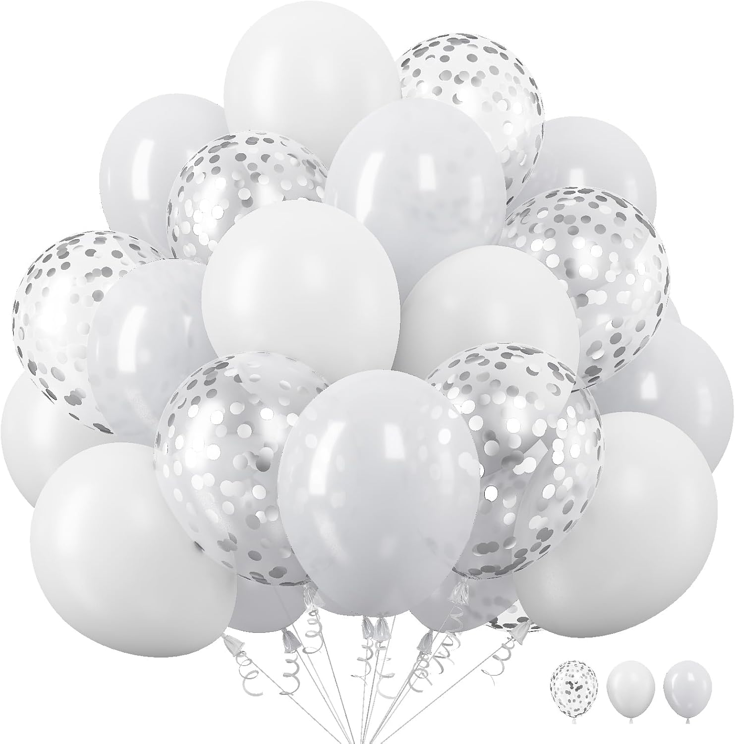 White Balloons, 12 Inch Pearl Pure White Ivory Latex Balloon with Silver Confetti Balloons for Boho Birthday Baby Shower Wedding Bachelorette Retirement Valentine’s Day Party Decorations