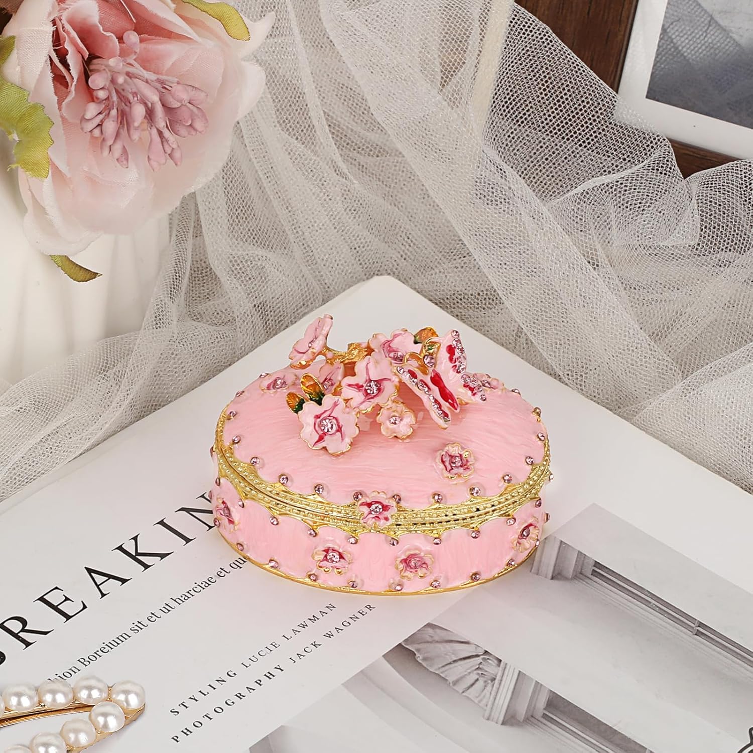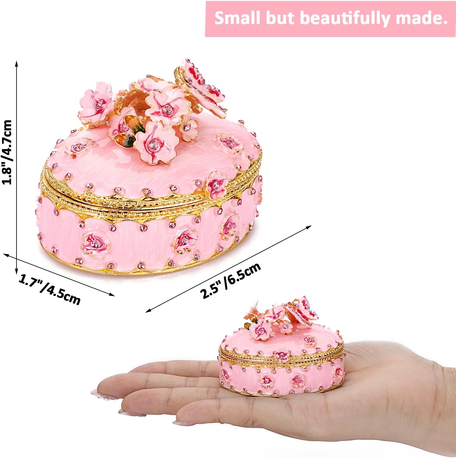ELLDOO Enamel Flower Butterfly Trinket Box, Mini Vintage Metal Hinged Decorative Box Ring Earrings Jewelry Organizer, Keepsake Home Decor Gift Box for Women Girls, Pink