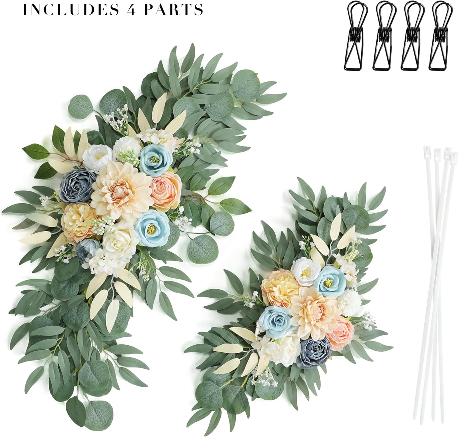 • 2. Package Included: Wedding Flowers Ornament x2 + Cable Tie x 4 + Metal Clip x 4 (Does not include wooden sign and bracket). Suitable for round, hexagonal, triangular arches, etc. You can also easily hang them on your fireplace, front door, window, or living room wall after the party.