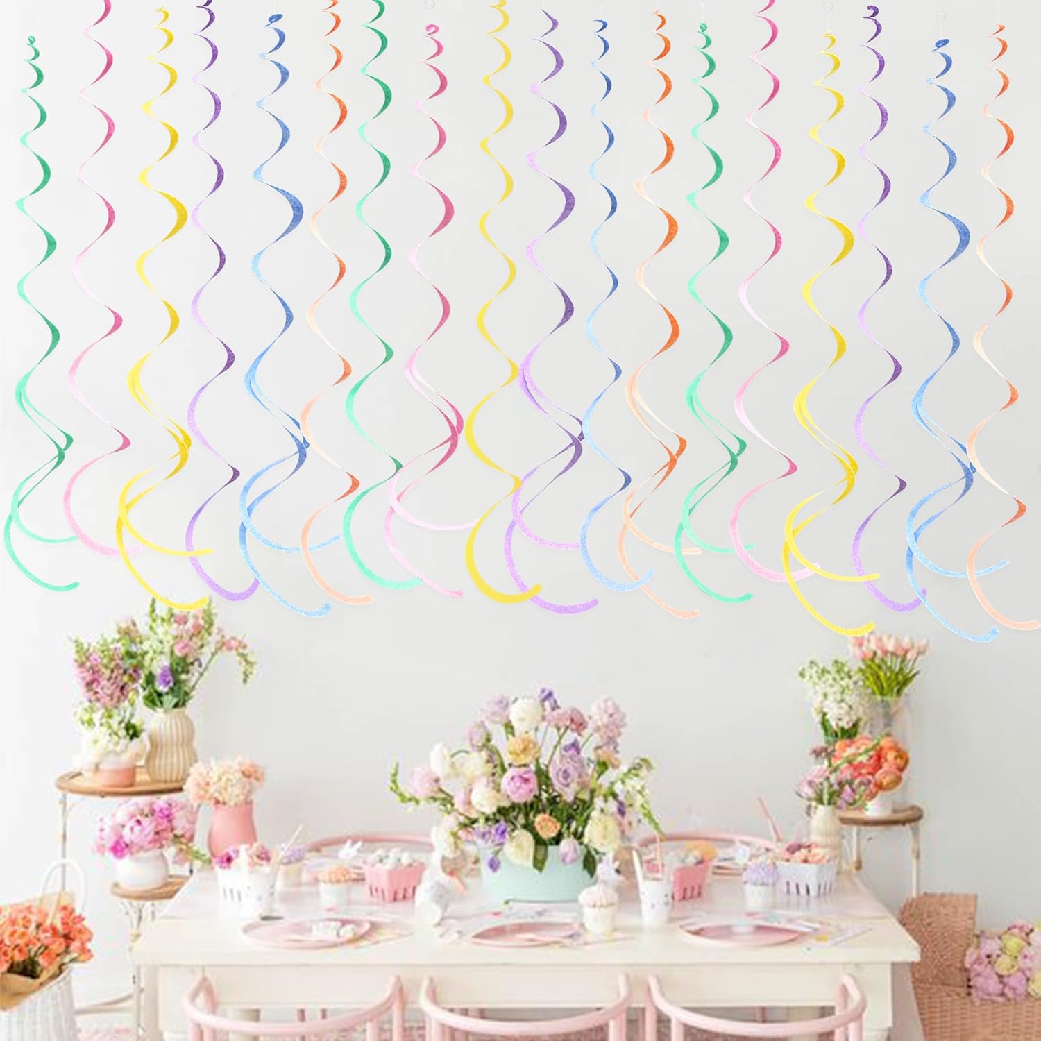 • Package Contains - 36 packs of pastel color swirl party streamer,Each swirl can extends to approximately about 2.62 feet long,Meeting daily general needs.Comes with 40 plastic hooks for hanging.