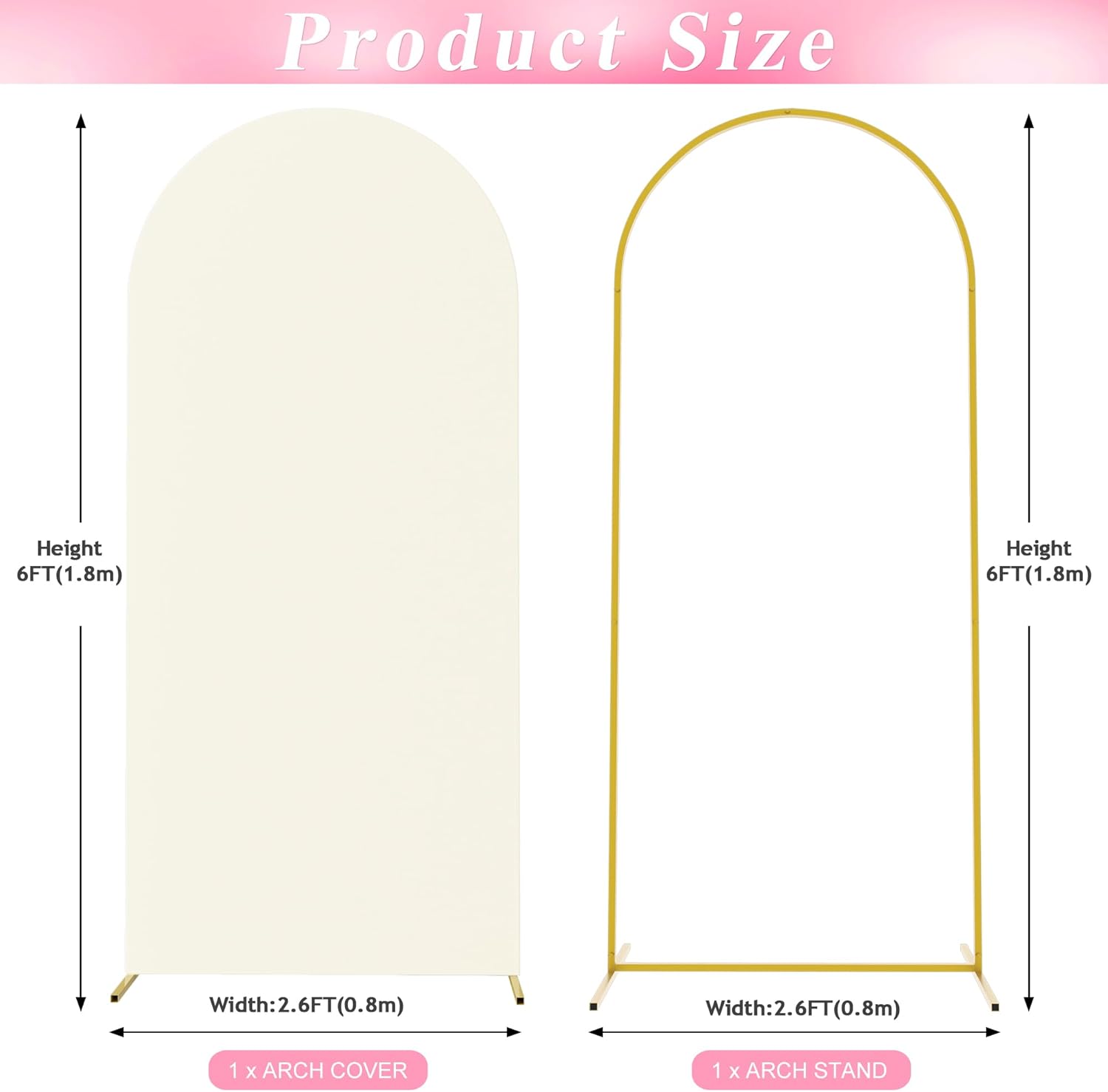 • 【Arch Stand and Covers Package】Package contains 1pcs wedding arch stand and 1pcs arch cover. Size: 6x2.6ft(HxW). Material: metal arch backdrop stand and spandex arch cover. Color: Ivory arch cover and gold wedding arch stand. Decorate your party with our gold arch stand and arch covers to create an epic decor for your celebration.