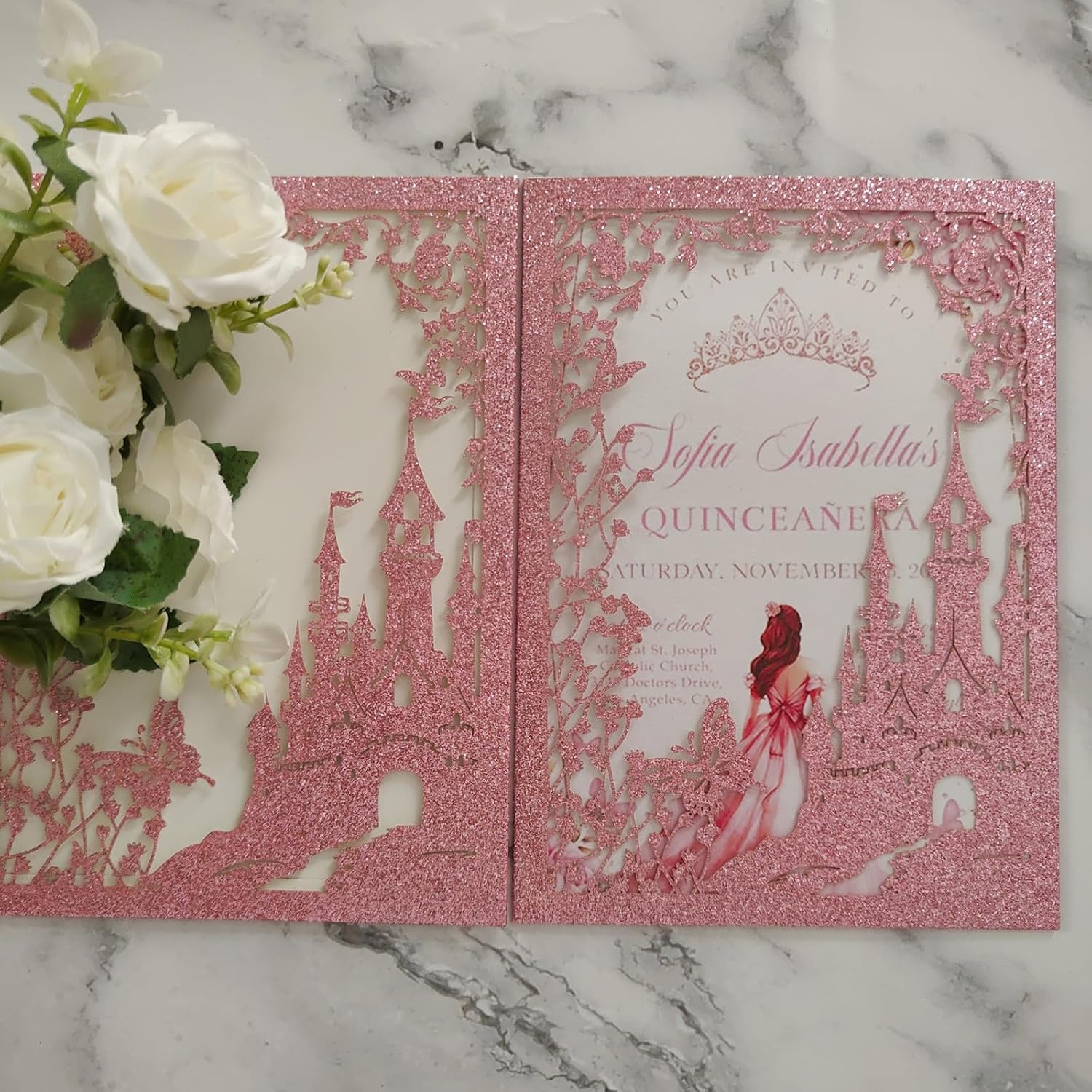 20PCS Castle Pocket Invitations, Quinceanera Invitations with Envelopes, Princess Invitation, Laser Cut quince invites (glitter pink)