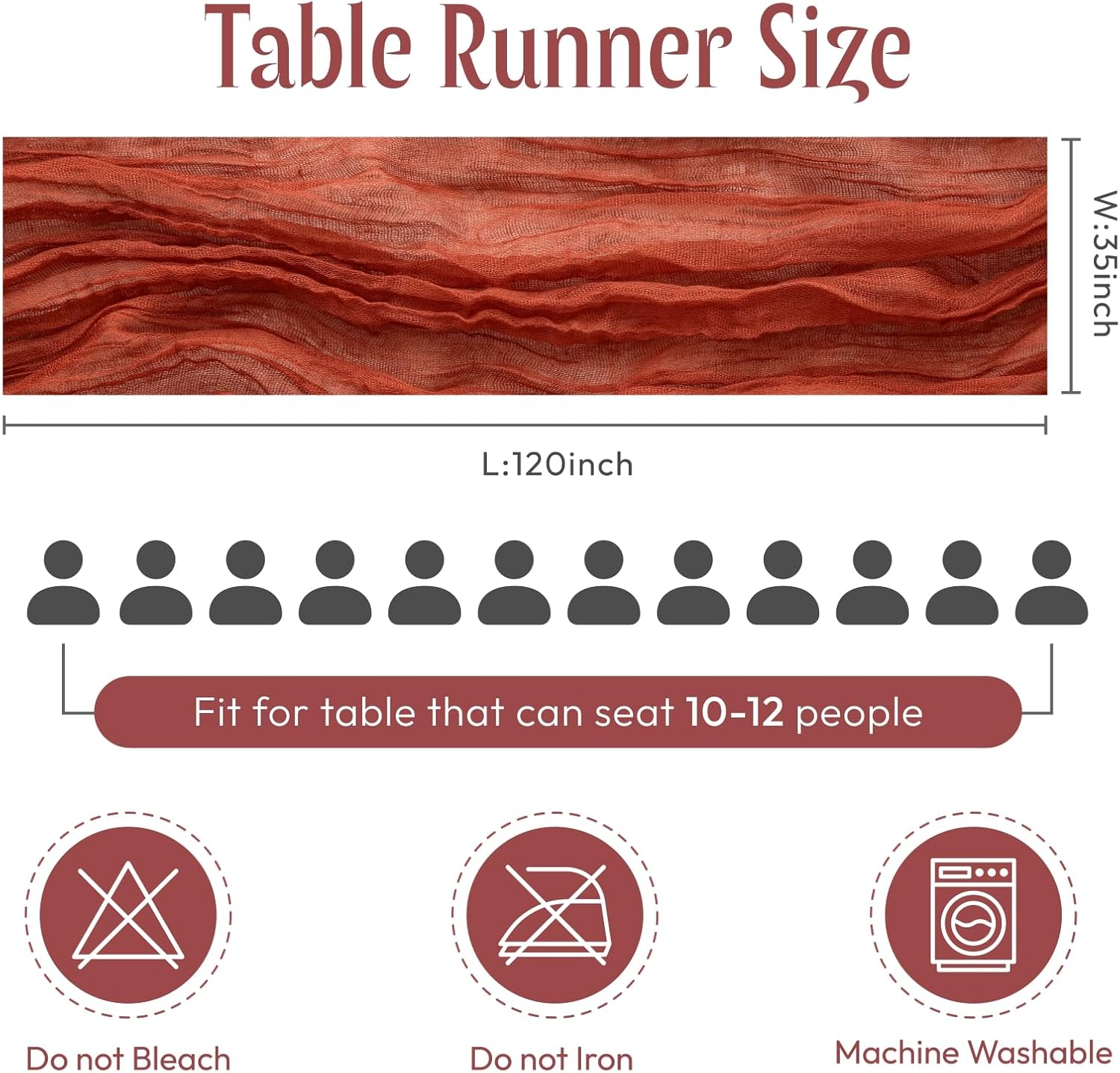 • 【Package Includs】1pcs Cheesecloth table runner (35" W x 120" L), neatly packed in a transparent plastic bag. This versatile table runner is specifically designed to fit most types of tables.