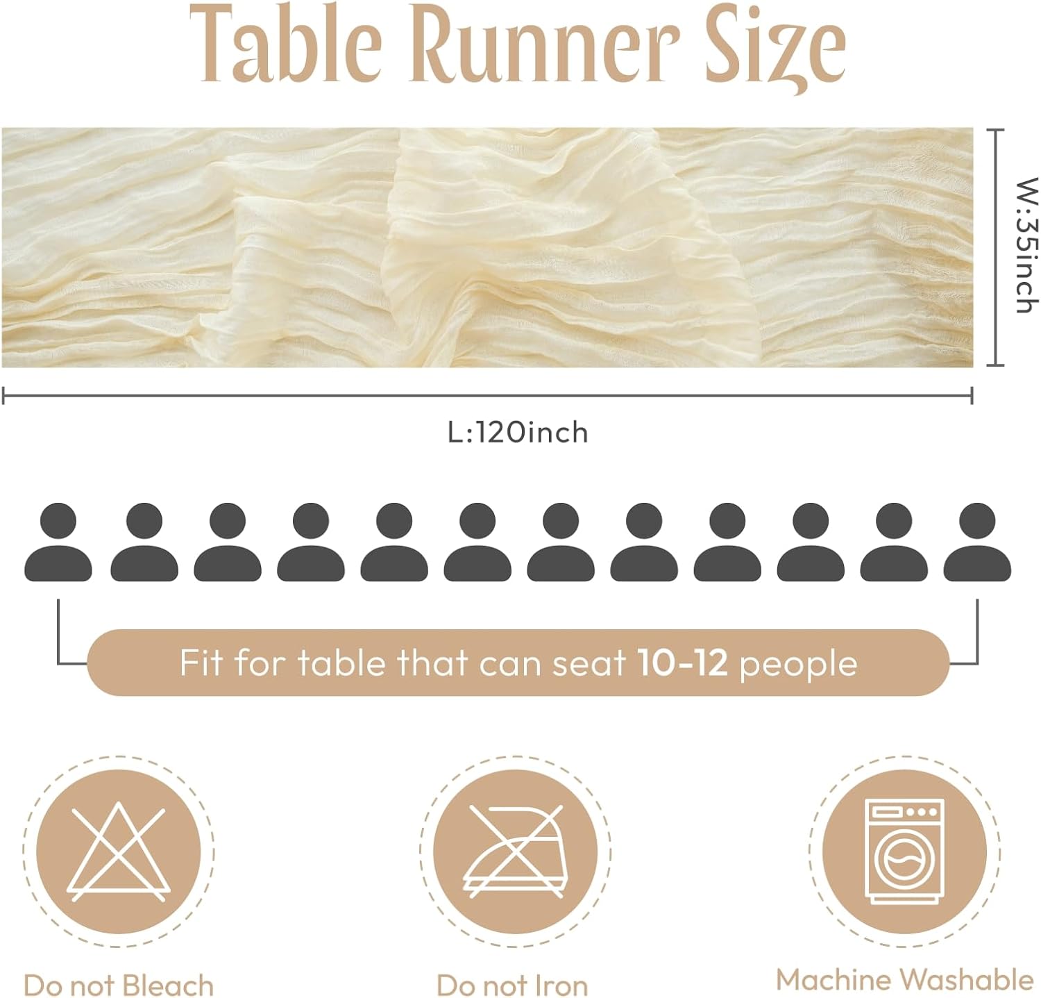 • 【Package Includs】1pcs Cheesecloth table runner (35" W x 120" L), neatly packed in a transparent plastic bag. This versatile table runner is specifically designed to fit most types of tables.