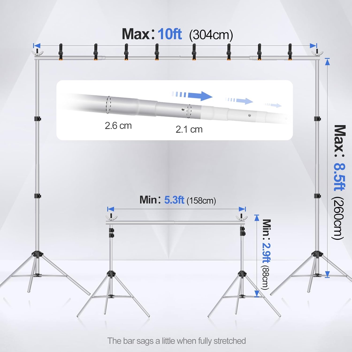 • 【Sturdy Tripod Backdrop Stand】 With adjustable height (2.9ft/0.88m–8.5ft/2.6m) , the aluminum alloy backdrop stand is durable, and the design of the tripod base ensures it won’t shake when fully extended to its maximum size.
