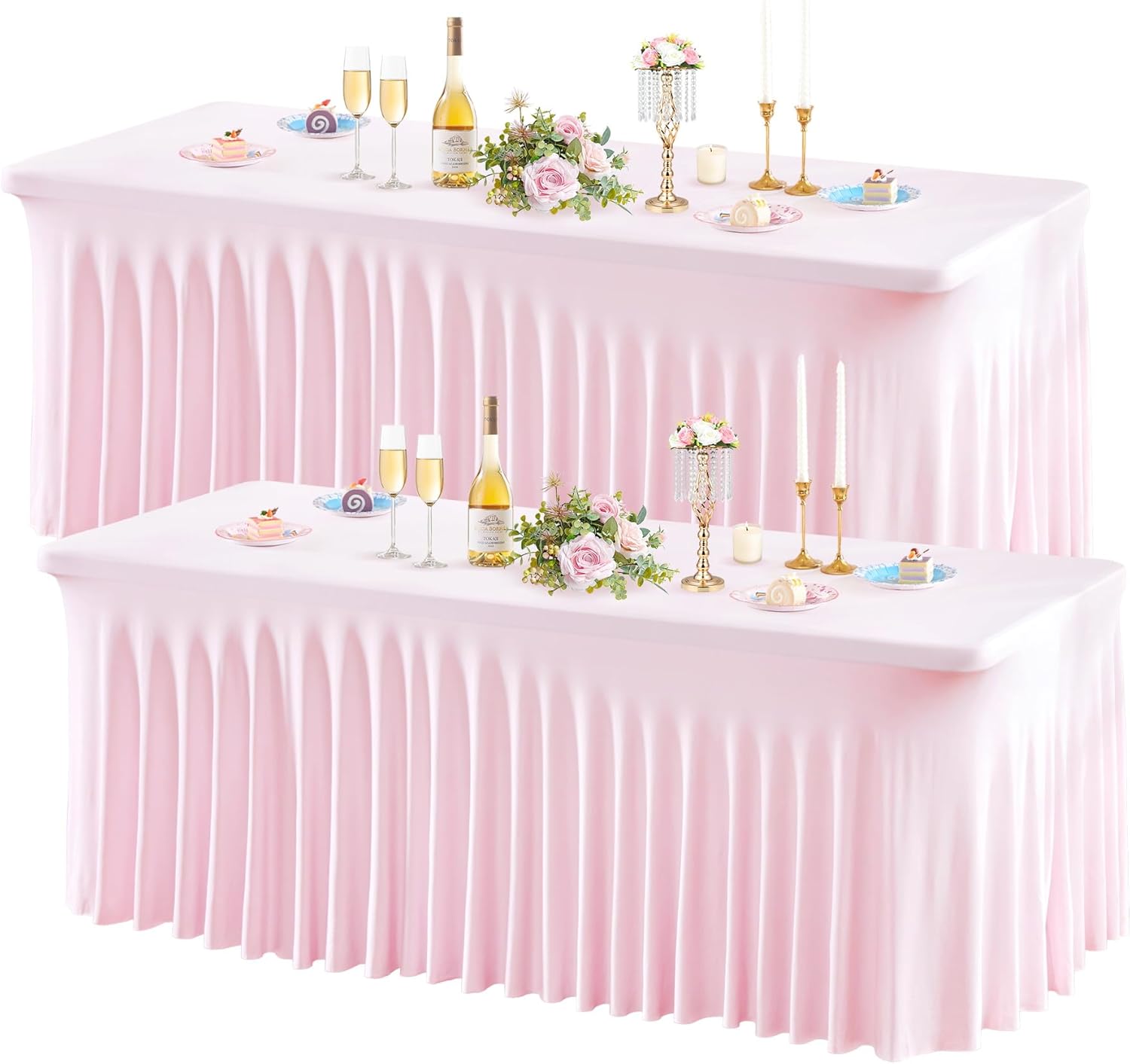 • 【Fitted Tablecloth Package】- 2 Piece Spandex Table Covers with Table Skirt. Material: Wrinkle Free and Stretchy Fabric. Color: Pink. Size: 48"L X 24"W X 29"H. Fitted for 4 foot rectangle tables. Change your table into a new look in few seconds with our tablecloths