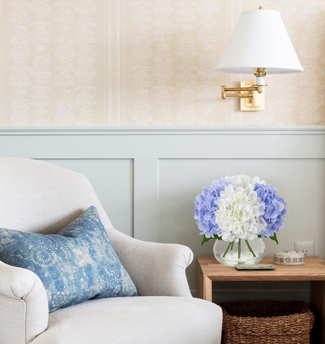 Hollyone Hydrangea Artificial Flowers with Vase White & Blue Silk Fake Flowers Arrangements in Glass Vase with Faux Water Faux Floral Bulk Bouquet Bathroom Table Centerpiece Shelf Home Decor