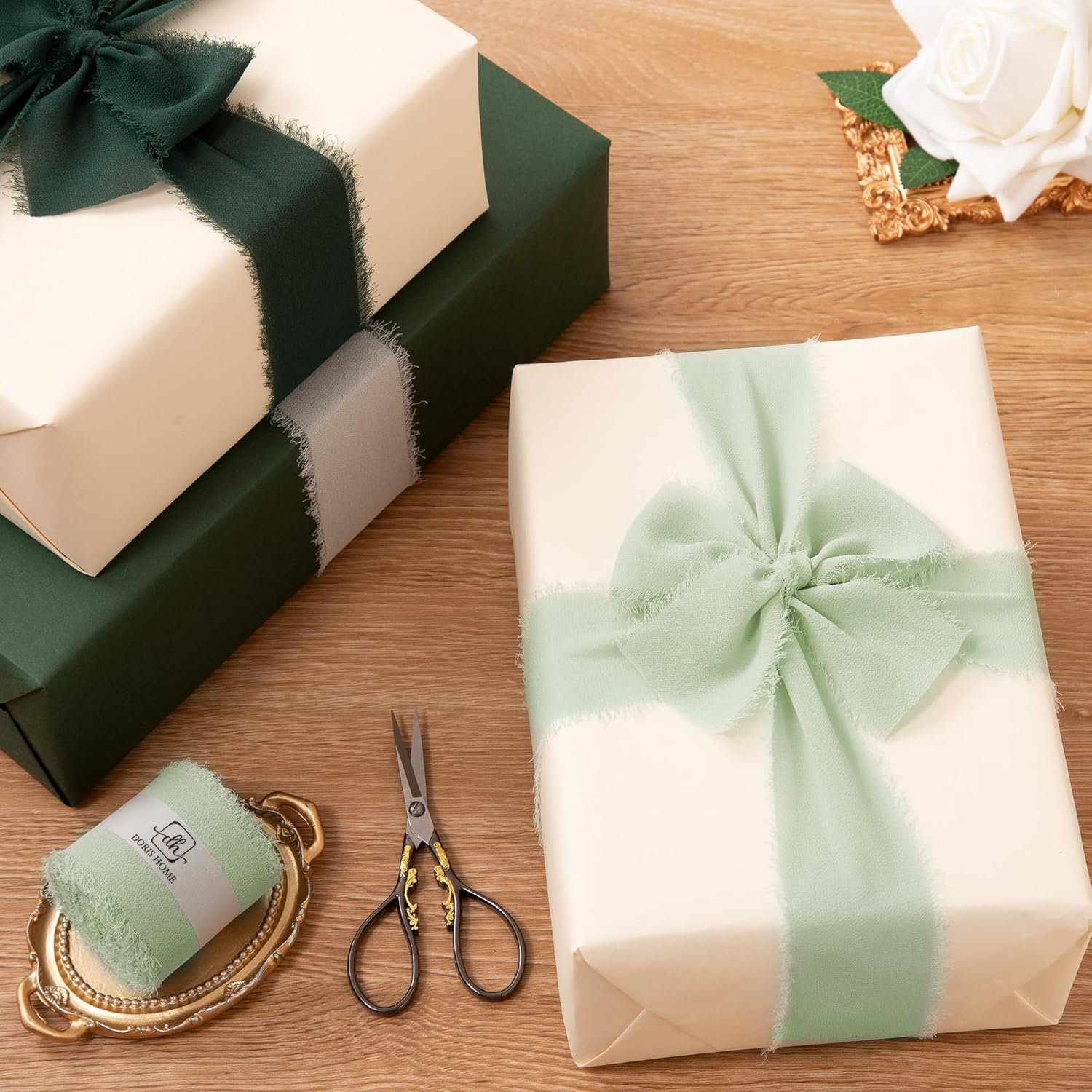 • 【Size and Color】Each roll of chiffon ribbon is 2 inches wide and 7 yards long, perfect for various creative uses such as making bows, decorating wreaths, and DIY crafts. This set includes 3 rolls sage green ribbons. These vibrant frayed ribbons add a rustic charm to your creations, ideal for bouquet wrap or gift ribbon.