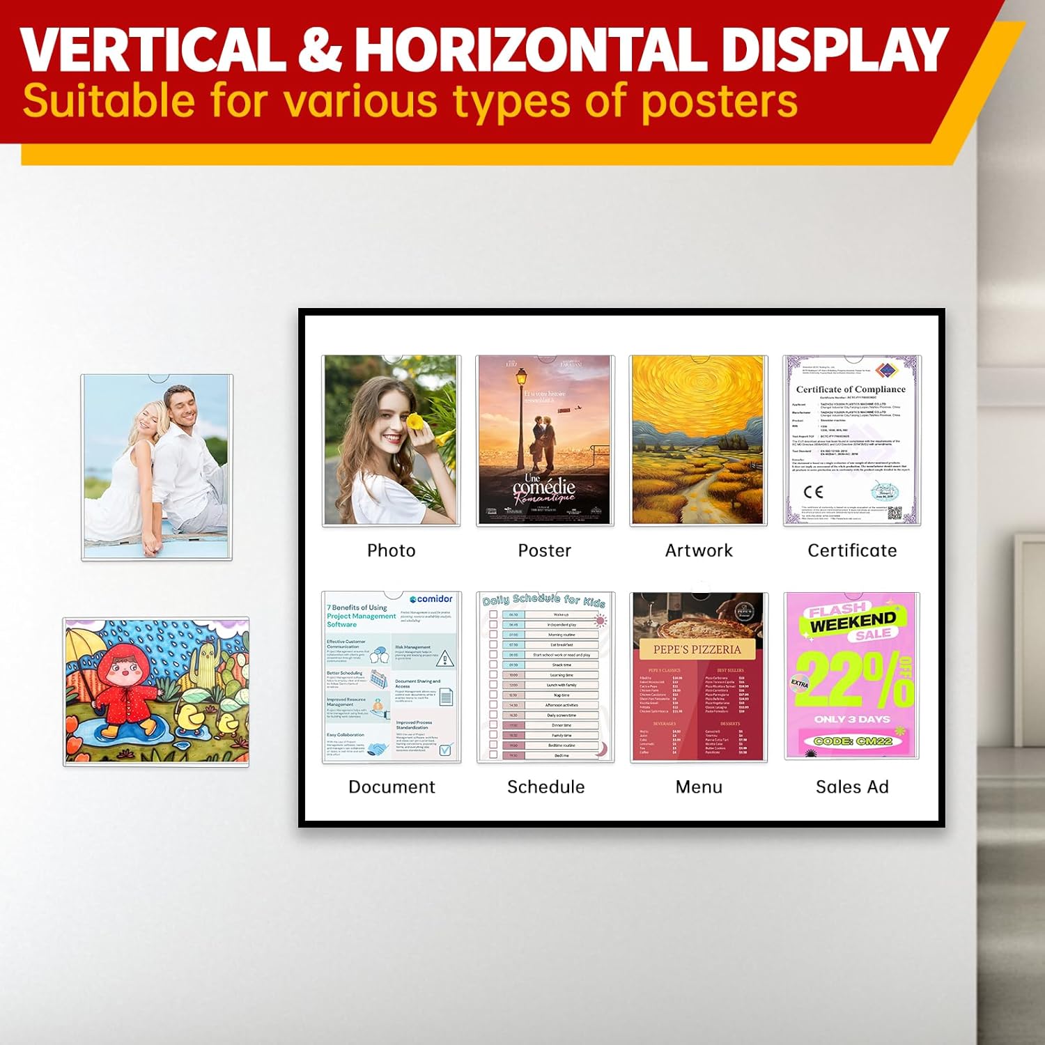 • 【DOUBLE-SIDED DISPLAY】Double-sided visibility design of reusable adhesive frames allows people to view content of posters from both sides on any transparent surface. Magnetic photo frames can display your posters horizontally or vertically according to your needs. Window sign holder is 0.04” thick and can hold about 4 sheets of 8 1/2 x 11 paper.