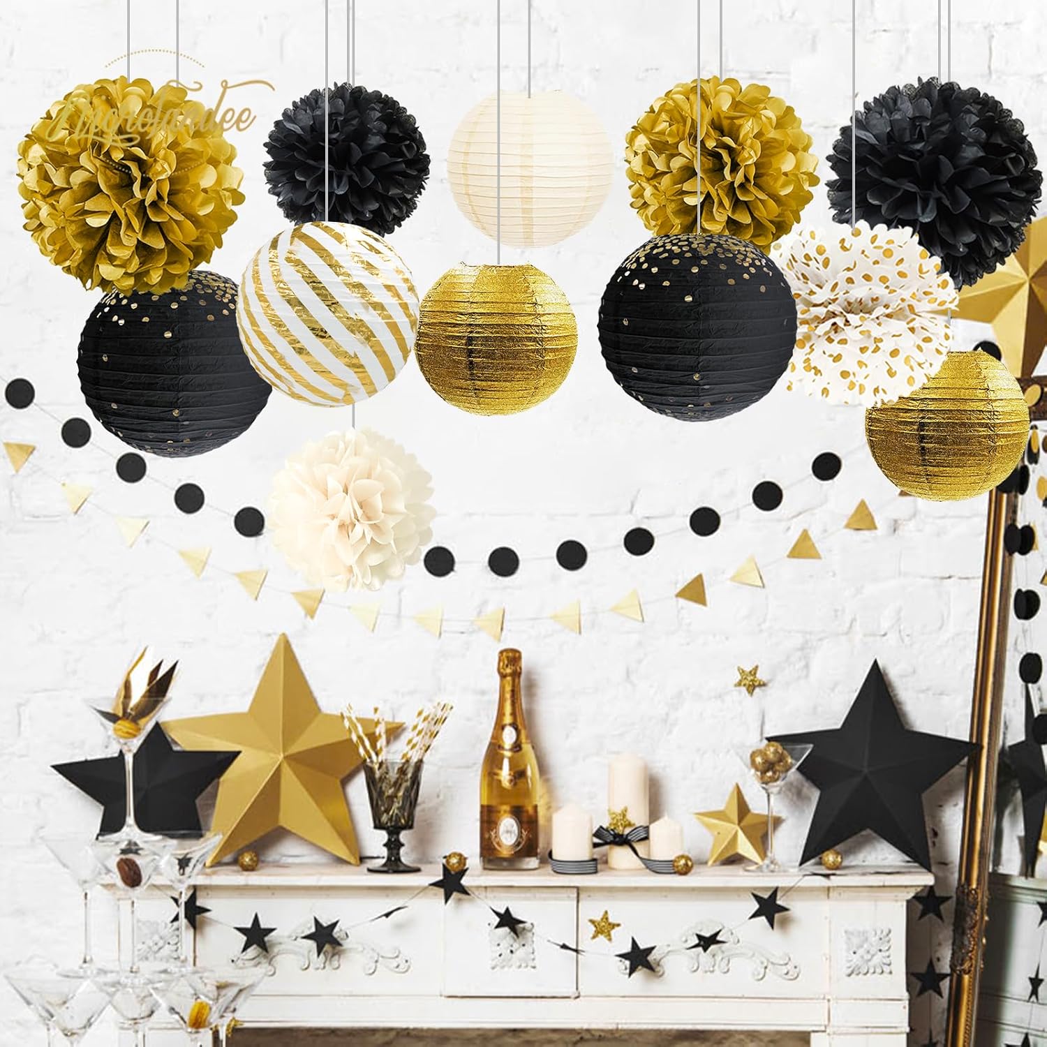 NICROLANDEE Black Gold Party Decorations,12PCS Paper Lantern Tissue Pom Poms Black and Gold Hanging Backdrop Decor for 2025 Graduation New Year Birthday Christmas Party Supplies