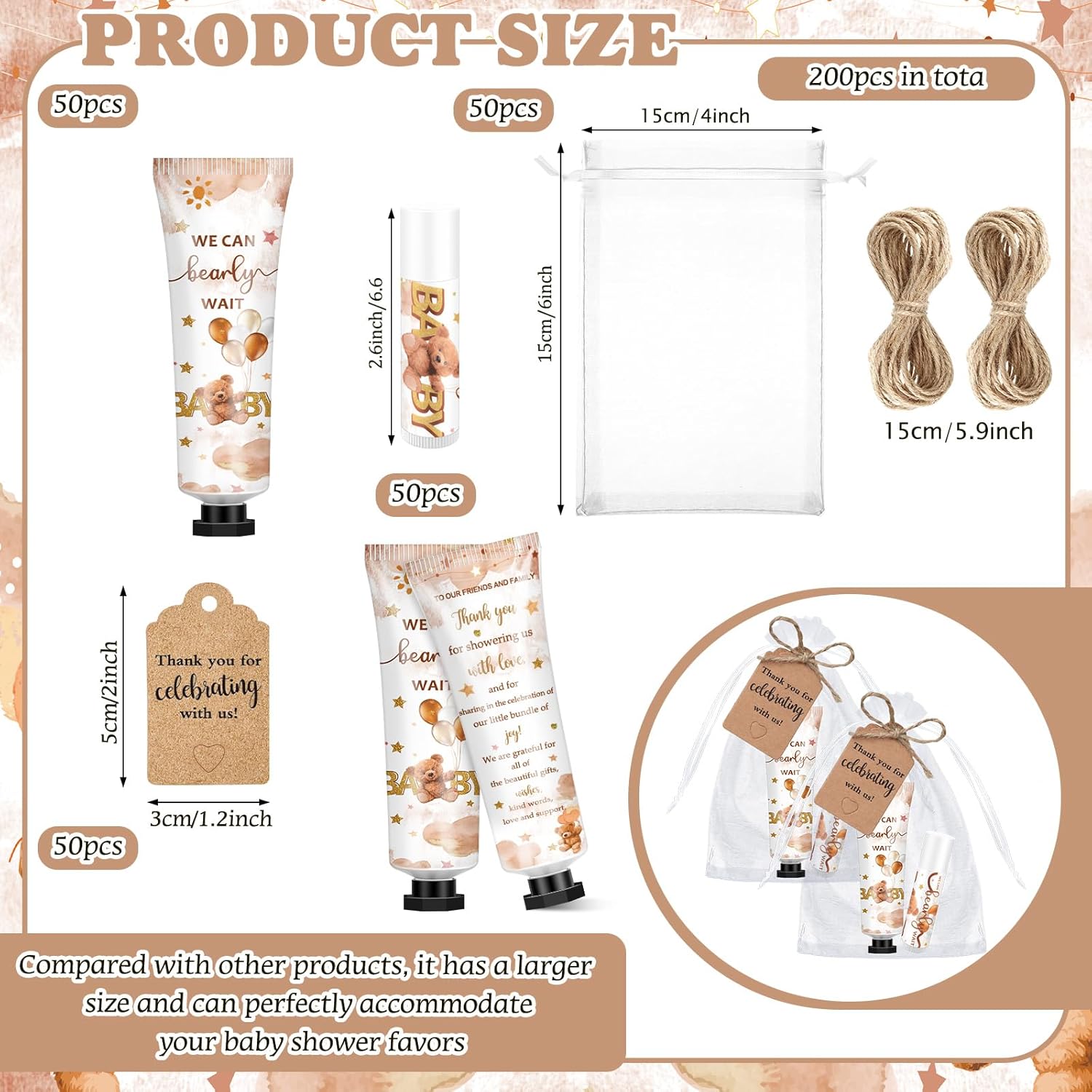 • Bear Baby Shower Guest Gifts: whether for a baby shower party, birthday, wedding, anniversary or simply as a treat for yourself, the package includes 50 each of brown Bear theme hand lotions, lip balms, organza bags, kraft paper tags with hemp ropes that add a splash of elegance to your gift setting
