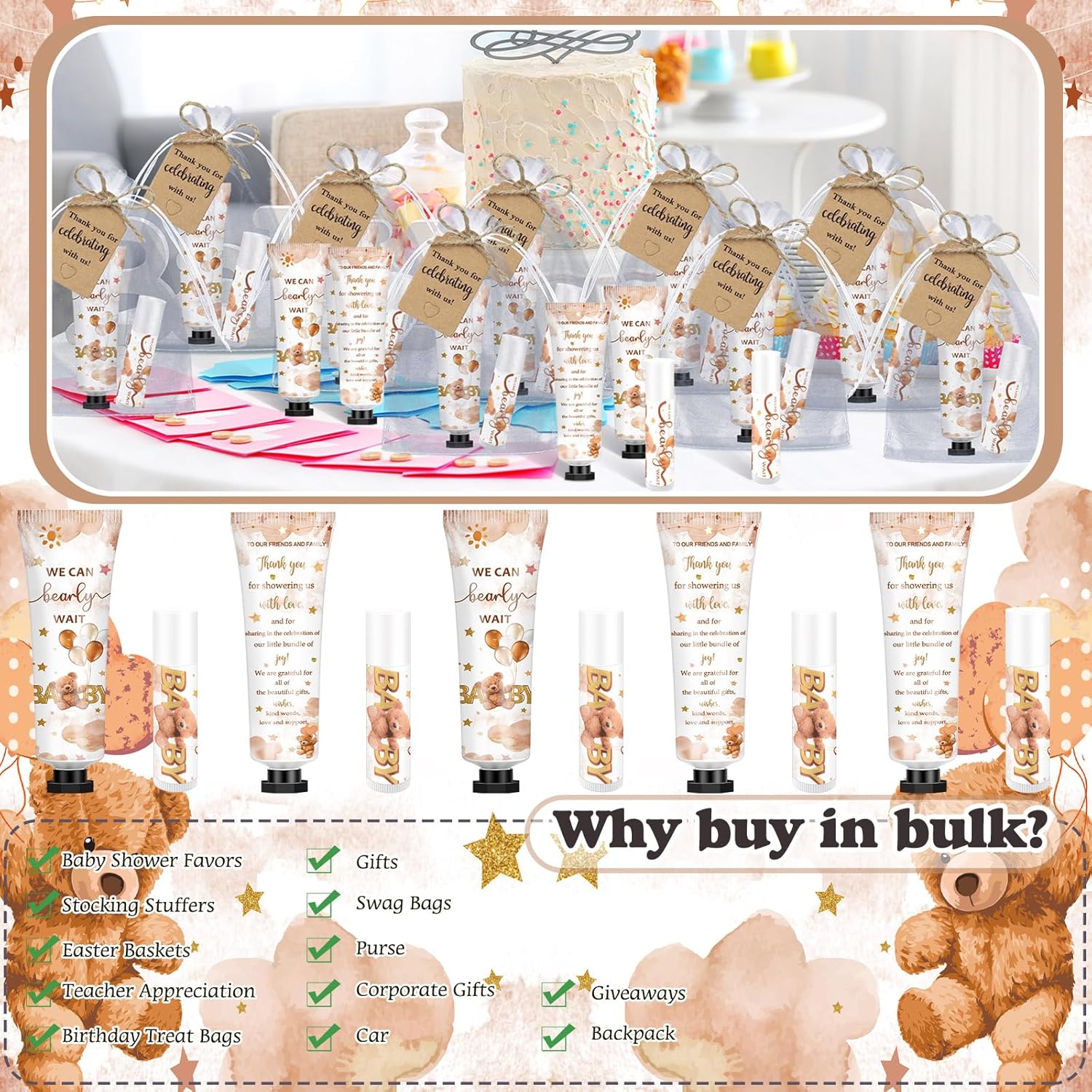 50 Sets 200 Pcs Baby Shower Hand Lotion and Lip Balm Gift Theme Baby Shower Party Favors Travel Size Hand Lotion and Lip Balm Bulk with Organza Bags Tags(Bear)
