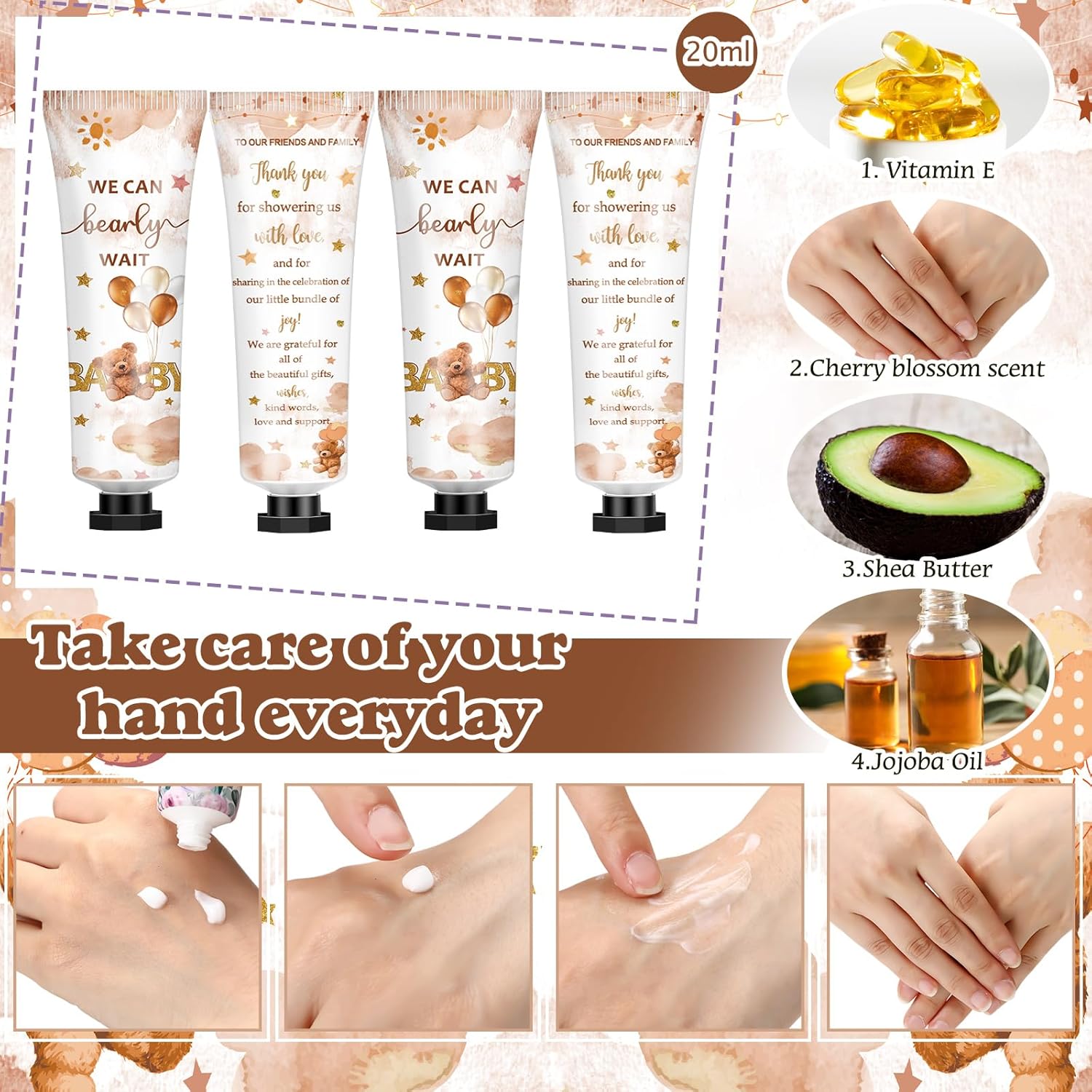 • Cute Little Bear Themed Design: charming borwn bear and balloon patterns are ushers of positivity while the warm and thankful words like [ we can bearly wait baby] , enhance the gift giving atmosphere; This ensemble of hand lotion and lip balm lifts up the charm quotient of any event whilst bringing a sense of unexpected joy
