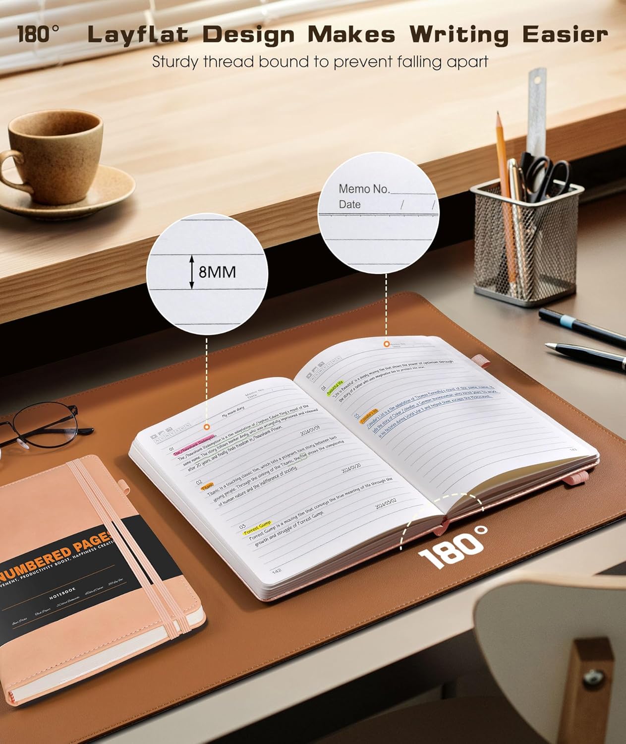 • 【180° Lay Flat Design】The 180° lay flat design, combined with a sturdy thread-bound binding, the leather notebook can easily to lay out flat makes taking notes more efficient, reading more convenient, which provide a comfortable writing experience. Rounded corner design makes the lined notebook not easy to be damaged and curled. Standard 8mm space classic college ruled journals, each journal page has “Memo No” and “Date” header to help you keep track of the date.