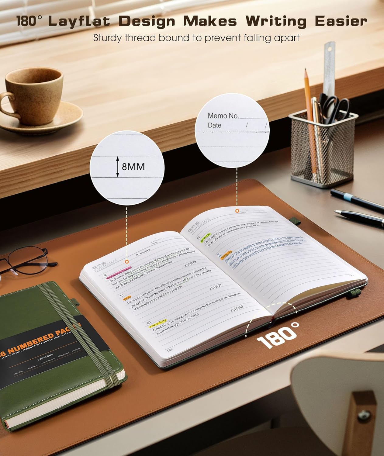 • 【180° Lay Flat Design】The 180° lay flat design, combined with a sturdy thread-bound binding, the leather notebook can easily to lay out flat makes taking notes more efficient, reading more convenient, which provide a comfortable writing experience. Rounded corner design makes the lined notebook not easy to be damaged and curled. Standard 8mm space classic college ruled journals, each journal page has “Memo No” and “Date” header to help you keep track of the date.