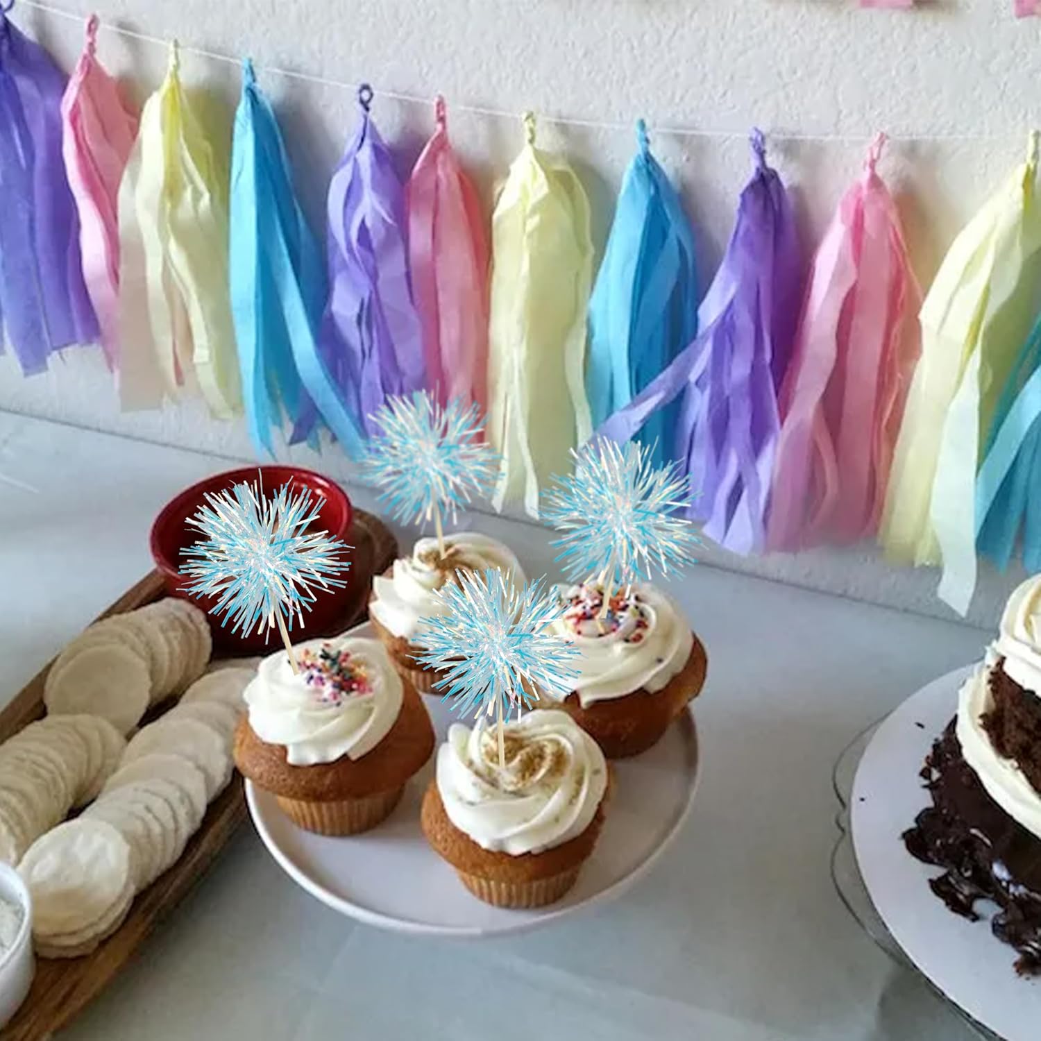 Gyufise 30Pcs Foil Firework Cupcake Toppers Sparkle Tinsel Cake Toppers Tinsel Drink Cake Decoration Cocktail Picks for Birthday Wedding Graduation Party Supplies Laser Blue